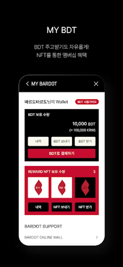 BDT is accumulated when purchasing products at the Bardo offline store, and it is possible to purchase products through the accumulated BDT and transfer them to others.