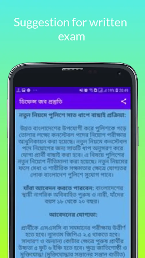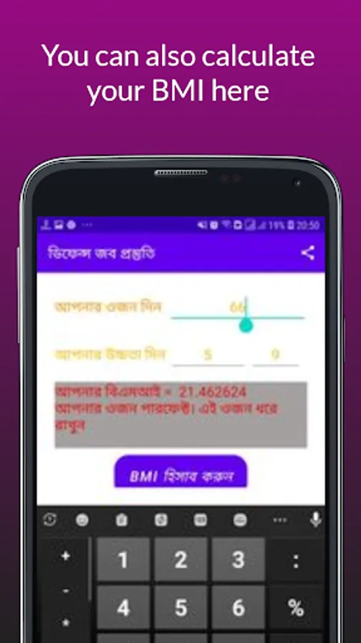 Here also has been shown what is the minimum age ,minimum educational qualification ,minimum height, weight and others physical qualification for applying this job. Users also can know what is the procedure of application step by step. By using this app you can calculate your BMI which is very important for getting job and after calculate your BMI if you over or under weight you can get suggestion for recovering yourself.