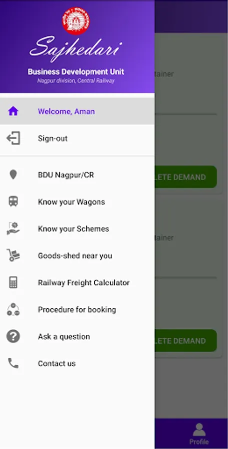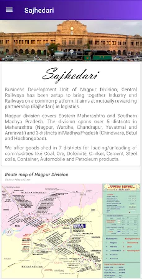 Business Development Unit (BDU) of Nagpur division, Central Railway proudly introduces "Sajhedari" (Partnership), an Official android app to acquaint Market with Railways, available infrastructure in Nagpur division/CR - like Good sheds and their location, various choices of Wagons, Railway schemes, FOIS freight calculator and procedure of registering an E-demand.