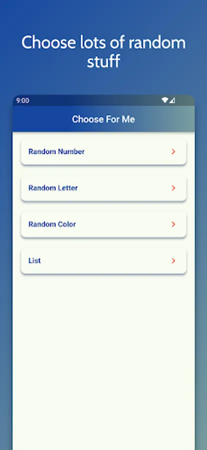 Choose For Me App can make random decisions for you in different categories. You can choose random numbers, random letters, random colors. Or you can create your own list and get random selections from them. You can create and save your own lists easily. And select random items from them whenever you want. When you can’t decide, just use choose for me and it can choose for you.