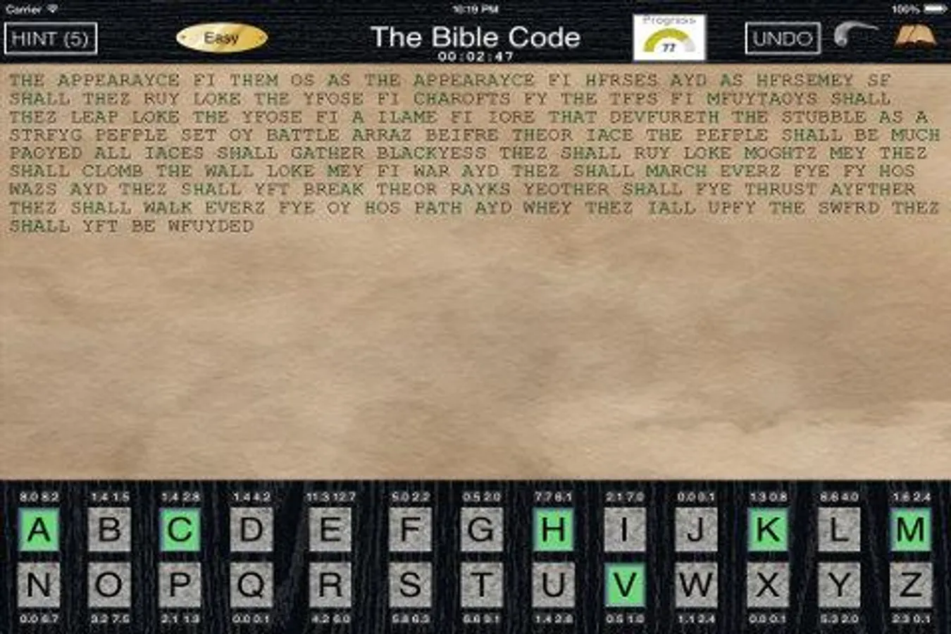 Try our first release as well, Holmes Free : the cryptic cipher code puzzle game. It's a similar game using the texts from The Adventures of Sherlock Holmes by Sir Arthur Conan Doyle.