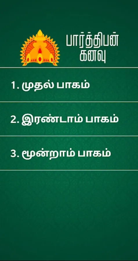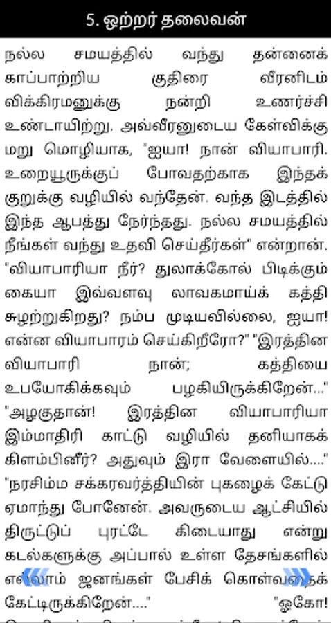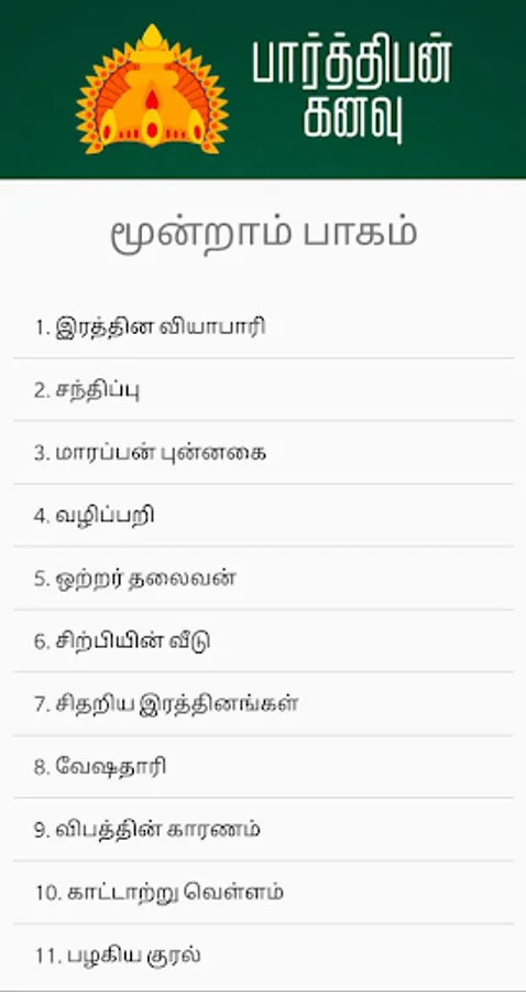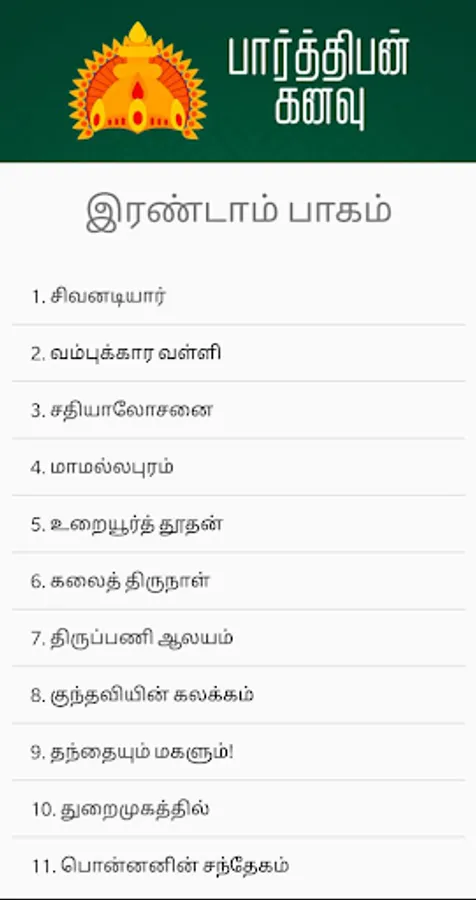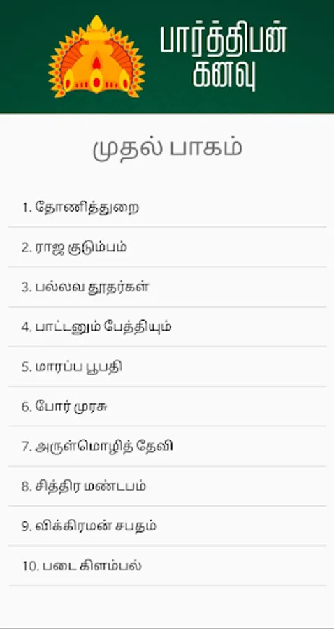 This Tamil novel chronicles the attempts of Vikraman, the son of the Chola king Parthiban, to attain independence from the Pallava ruler Narasimhavarman I.