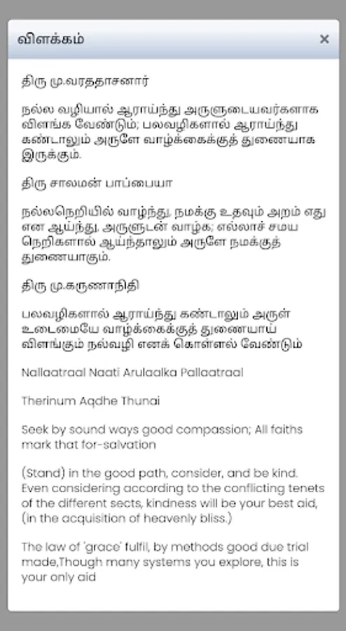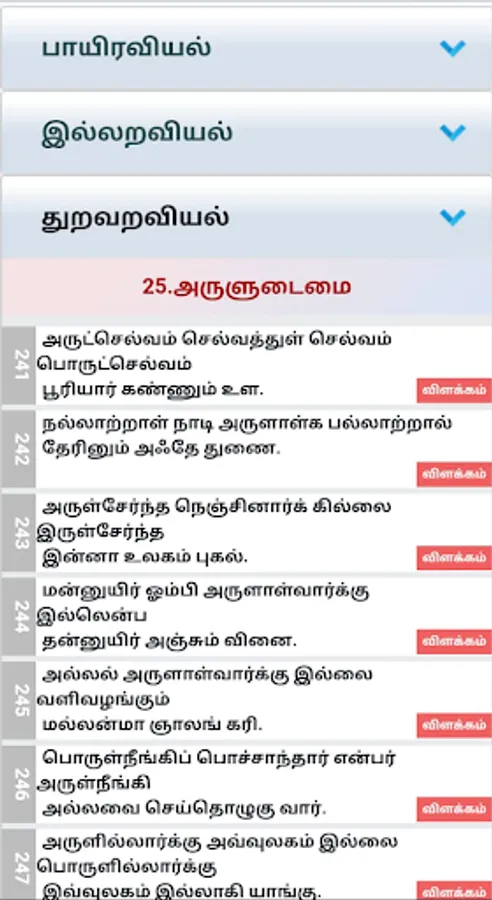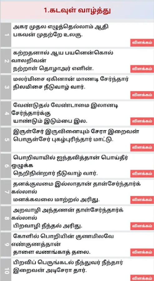 திருக்குறள் (Thirukkural) உலகப்புகழ் பெற்ற தமிழ் இலக்கியமாகும். இதனை இயற்றியவர் திருவள்ளுவர் என்று அறியப்படுபவர். இதில் 1330 குறள்கள் பத்து பத்தாக 133 அதிகாரங்களின் கீழ் தொகுக்கப் பெற்றுள்ளன. திருக்குறள் சங்க இலக்கிய வகைப்பாட்டில் பதினெண்கீழ்க்கணக்கு எனப்படும் பதினெட்டு நூல்களின் திரட்டில் இருக்கிறது. இது அடிப்படையில் ஒரு வாழ்வியல் நூல். மாந்தர்கள் தம் அகவாழ்விலும் சுமுகமாக கூடி வாழவும், புற வாழ்விலும் இன்பமுடனும் இசைவுடனும் நலமுடனும் வாழவும் தேவையான அடிப்படைப் பண்புகளை விளக்குகிறது. இந்நூல் அறம், பொருள், இன்பம் அல்லது காமம் என்னும் முப்பெரும் பிரிவுகளாய் (முப்பால்) பிரித்தும் அழகுடன் இணைத்தும் கோர்த்தும் விளக்குகிறது.