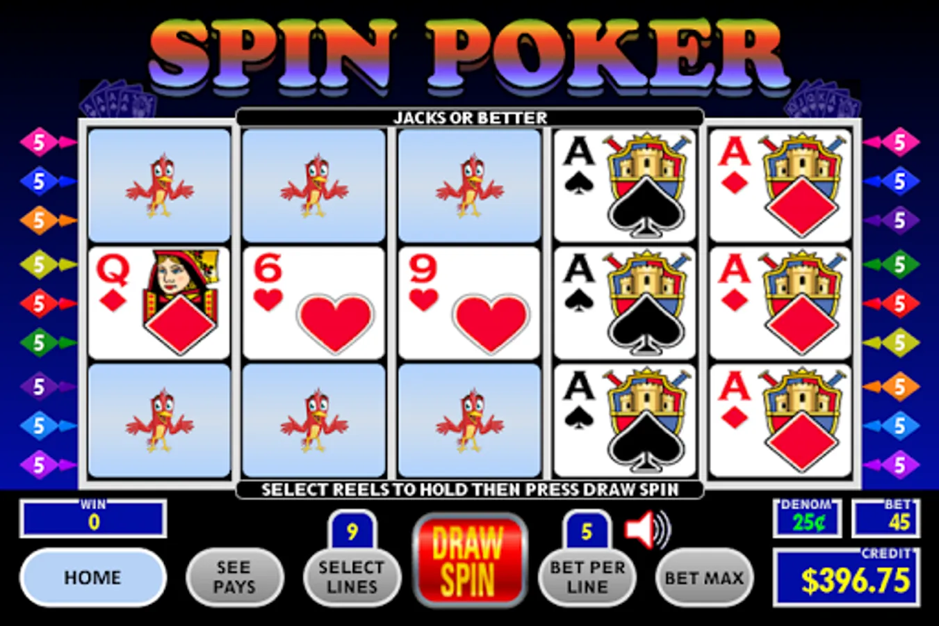 Vegas Casino Spin Poker has a cool twist over the regular Video Poker games. Your goal is to make the best poker hand with the 9 available pay lines. Play 1 line all the way up to 9 lines at once with denominations starting from 1¢ penny through $1 dollar per line with the max bet being 5 credits per line. Have fun!