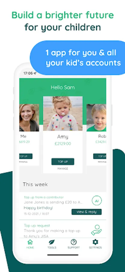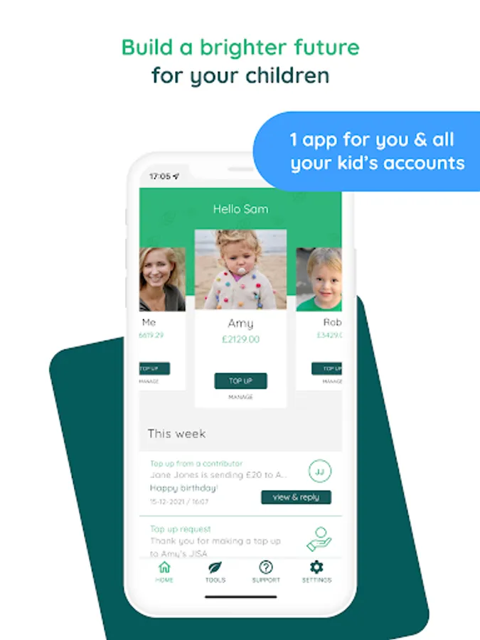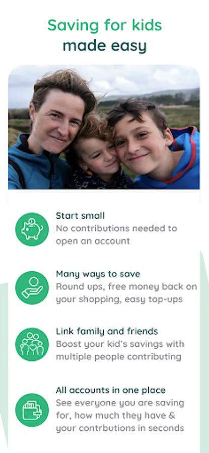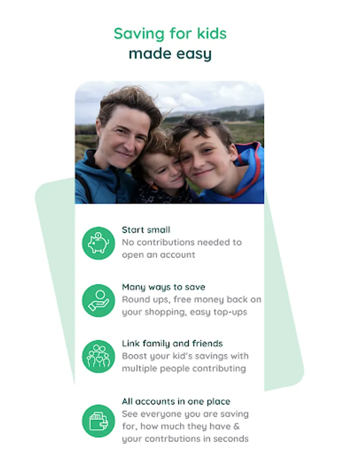 Packed with tools to help you with saving money, it only takes two minutes to set up savings accounts for any/all of your kids or even yourself, all through the same money saving app! With no minimum or regular contributions required, you can invite family & friends to link directly to your children, collect free savings on your shopping, round up your spare change, or easily top up your accounts whenever you want.