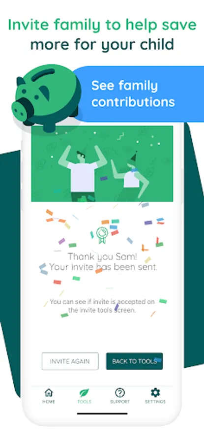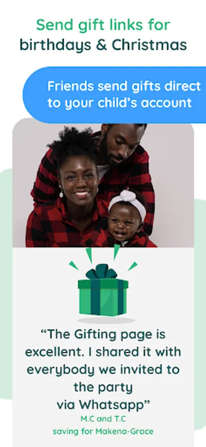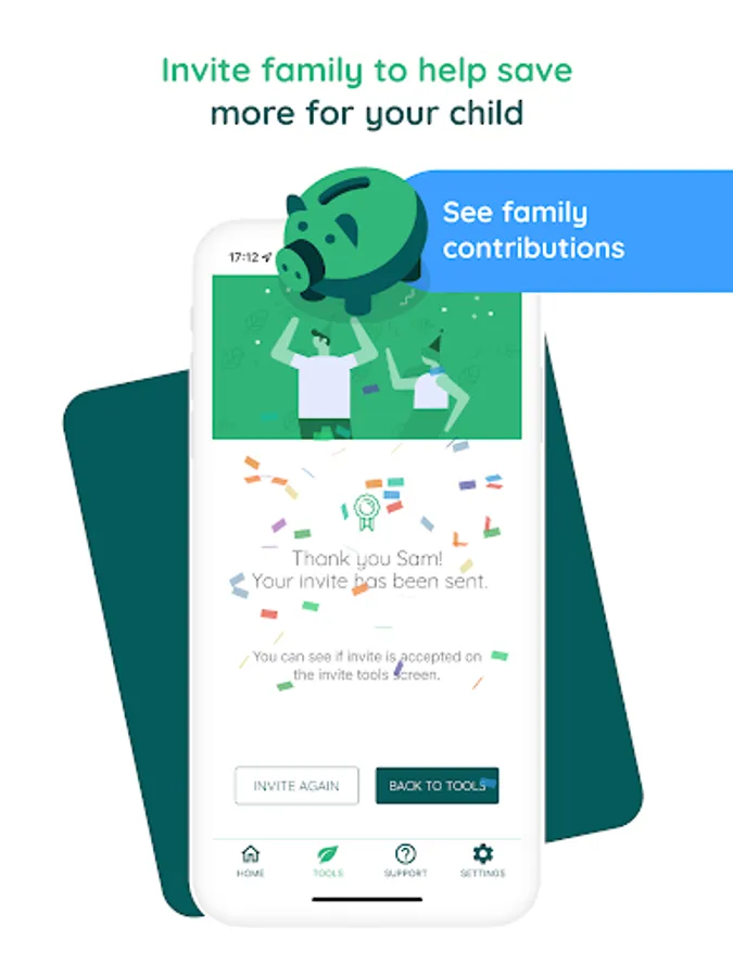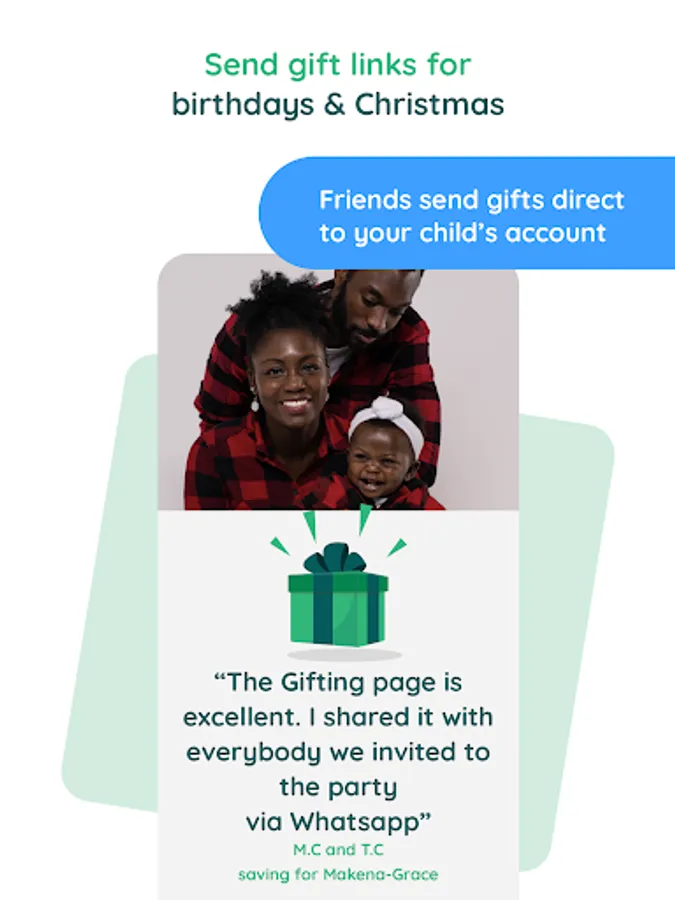 With our unique invite, grandparents, aunts, uncles… can connect to your kid’s savings account and can contribute directly, send gift messages and view how they have helped them save for your kids.