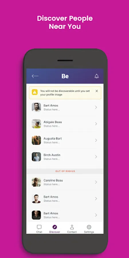 BeDiscoverable App, BeApp, or simply Be, allows you to see social media accounts of the people, products, and places in your immediate vicinity (the persons closest to you appear top of the list, grey accounts further down the list are outside your set discovery radius).