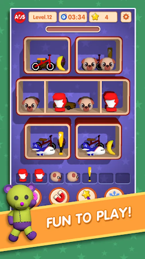◈Just tap to place the objects into the bar. Three same objects will be collected. Collect all the objects as fast as possible.