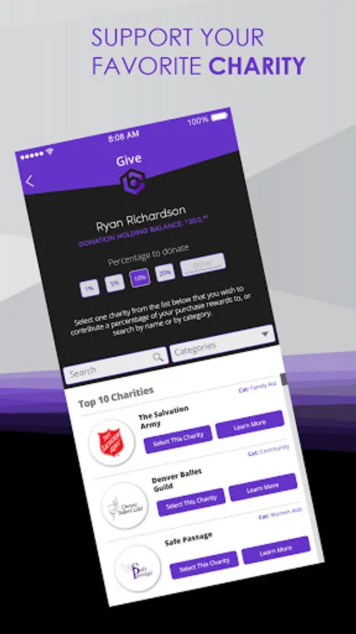 By making purchases at any of our participating merchants, users receive rewards; the only requirement is to give a percentage of those rewards to a worthy cause. All users will have the opportunity to select from a variety of charities or even nominate local organizations or fundraisers of their own!