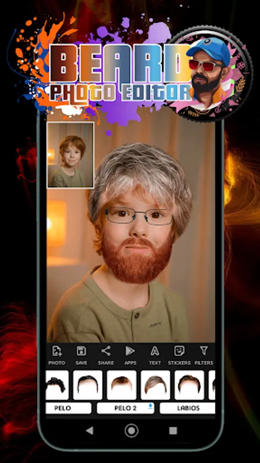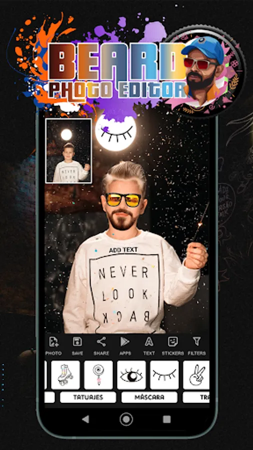 Beard Man Photo Editor App is simple, very effective and realistic. The perfect app to add a real beard to all kinds of photos for men, women, boys and girls. Complement your photos with text and new hair, beard and mustache styles. Add all kinds of accessories to your photos with a real beard and mustache, you can also add hat stickers, tattoos, sunglasses and more accessories.