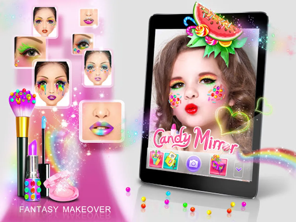 Apply virtual eye shadow, lipstick, glitter, ready-to-wear looks to live video of yourself for no-mess candy style makeovers.
