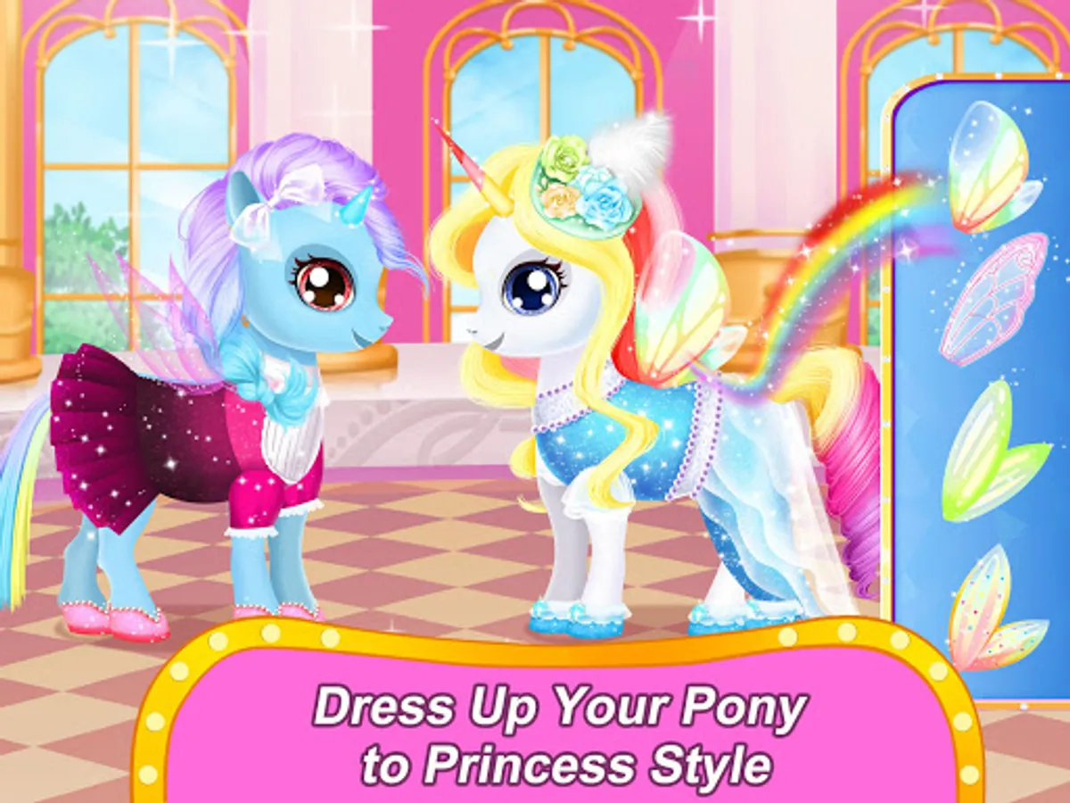 Today is our princess birthday. All little girls birthday wish is to have a pony pet. Finally, today our princess birthday wish come true. She saw a flying gift box through the window over to her. Oh my god, that is a big surprise. What is in the box? Tap to open. You can't imagine what it is inside. It is a pony, a little cute pink pony. Now our princess has a pony pet. Let's start to help our princess take care of her