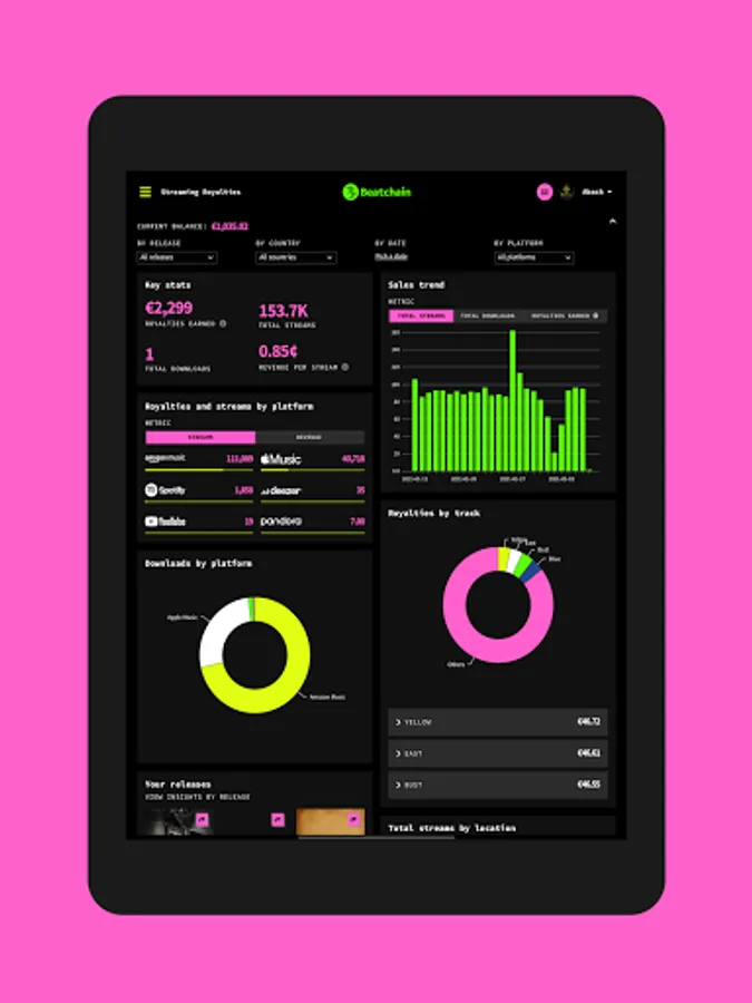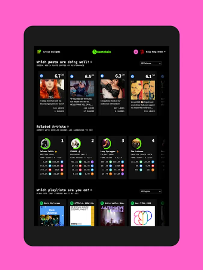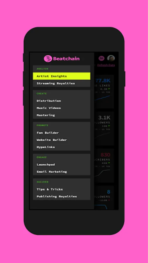 The Beatchain platform provides musicians with the tools and data they need to engage and grow their fanbases. We bring your data from around the internet into one app to help you understand your audience, across Facebook, Instagram, YouTube, Spotify and more!