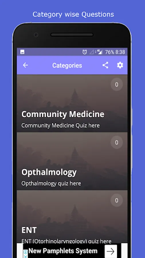 • There are various categories based on subjects like Anatomy, Physiology, Biochemistry, Forensic medicine, Microbiology, Community Medicine, Orthopaedics, Anaesthesia, PaediatricsMedicine, Surgery, Radiology, Pathology, Pharmacology, Gynecology, Obstetrics, etc.