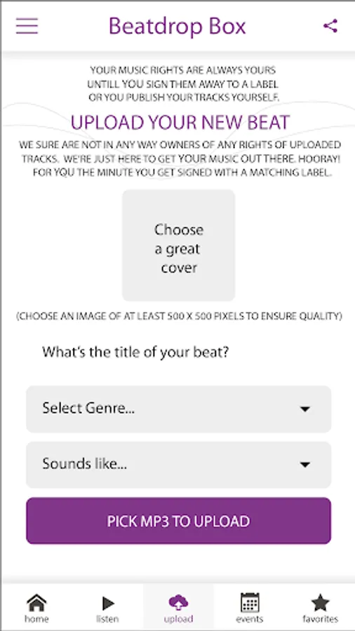 FINAL RELEASE NOTICE: BOTH YOUR MUSIC AND COVER YOUR MATERIAL ARE RATED MODE TO ENSURE QUALITY OF THE APP CONTENT. IF YOUR TRACK IS DELETED SOME TIME AFTER UPLOADING PLEASE TRY AGAIN WITH BETTER AND RESOLUTION HIGER COVER ART AND / OR A BETTER TRACK VERSION. THANKS FOR UNDERSTANDING!