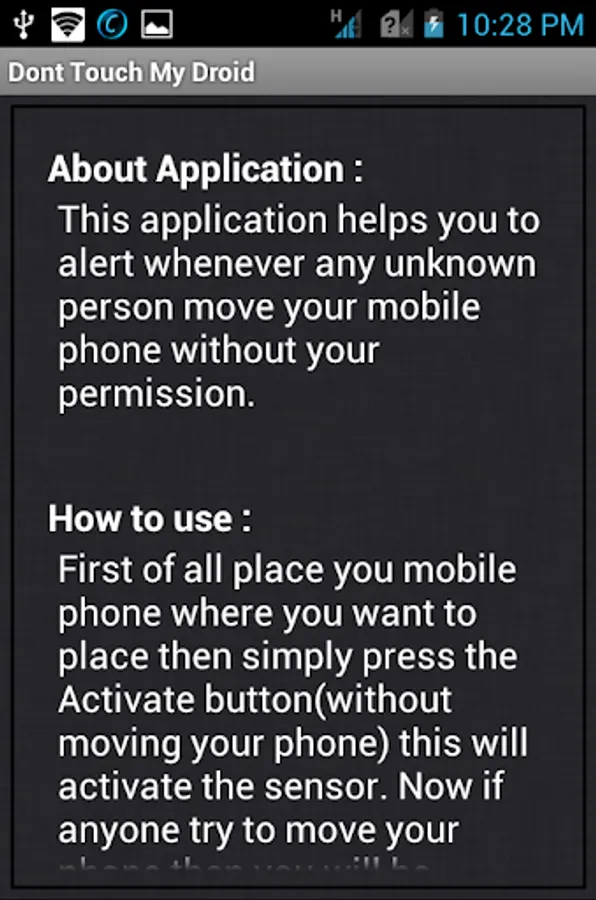 First of all place your mobile phone where you want to place then simply slide the Activate button(without moving your phone) this will activate the sensor. Now if anyone try to move your phone then you will be notified by siren.