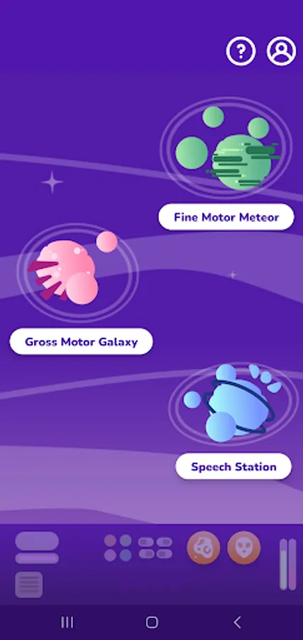Base Level: Allows you to explore a gross motor, fine motor and speech exercise to get some insightful information about the Dystant Galaxy application.