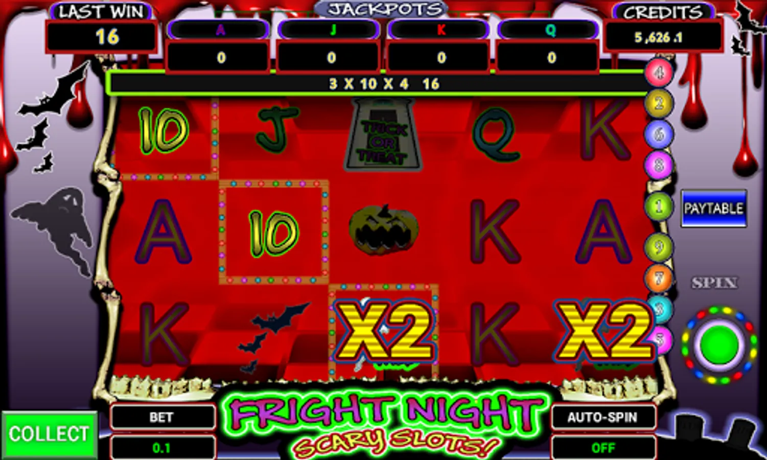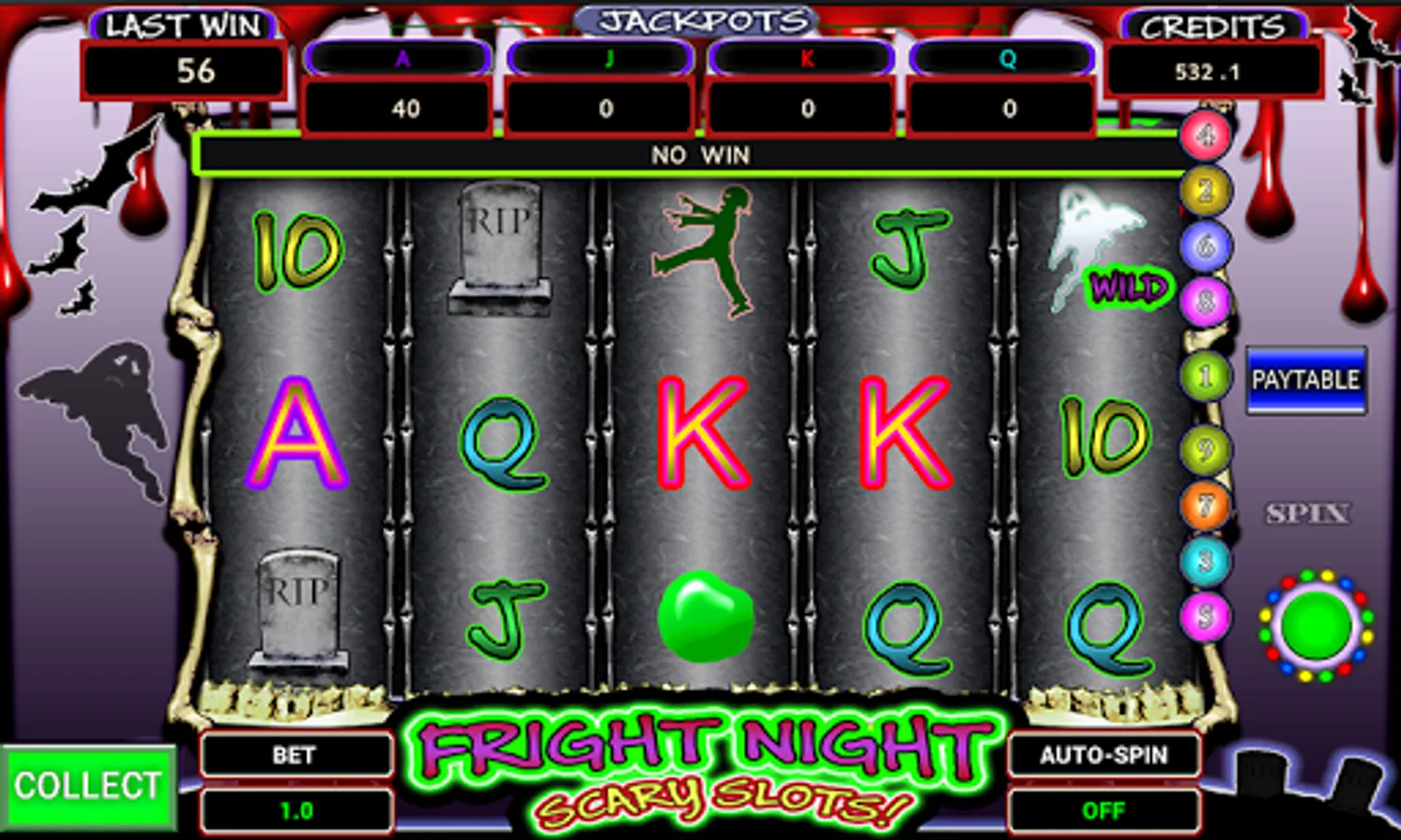 A Great scary Halloween style slot machine with HUUGE payouts, multipliers, casino fun games featuring blood sucking Zombies, spooky bats, graves and pumpkins, with progressive Jackpots. Packed with horror theme features Bonus Feature games: The walking dead Killer Zombie Cash Grab See how long you can survive before a walking dead Zombie get ya!. Keep surviving, keep on winning. Watch out though! One scratch or or toxic bite- its all over! Pumpkin Spirit Wheel of Fortune: pumpkin Spirits are out performing their usual Night Dance. Stop wheel, win that prize. Halloween Game. Bopping for Apples: An old halloween favourite. Halloween Game : Knock, Knock! Trick Or Treat Evil Blood Thirsty Bat shooting: Bash evil Creatures for free spins Looting Grave Diggers: The buried are turning into Terrifying Evil walking dead. Raid for cash before they awake and you experience hell. 6 Horror Theme Features Max 9 lines Five A Kind Progressive Jackpots Wild symbols all reels Variable scary stakes Auto-Spin scare Reset to receive credits any time Horrific Horror SFX Animated Spooky symbols Last bet won Unlimited play Welcome Bonus Daily Fright Prize Free Spin bonus multipliers Random Reels each app start means fresh slots and odds (brand new slots machine) Check out some of our other gambling Machines, Casino games plus popular and some of the best retro emulations. Good Luck and enjoy Fright Night Scary Slots. Avoid spooky Monsters from Dusk til Dawn. Sweet Dreams! Don't let scary hungry bloody suckers bite. They really suck! If you want to know the latest news, please visit our fans page: https://www.facebook.com/beatsnbobs