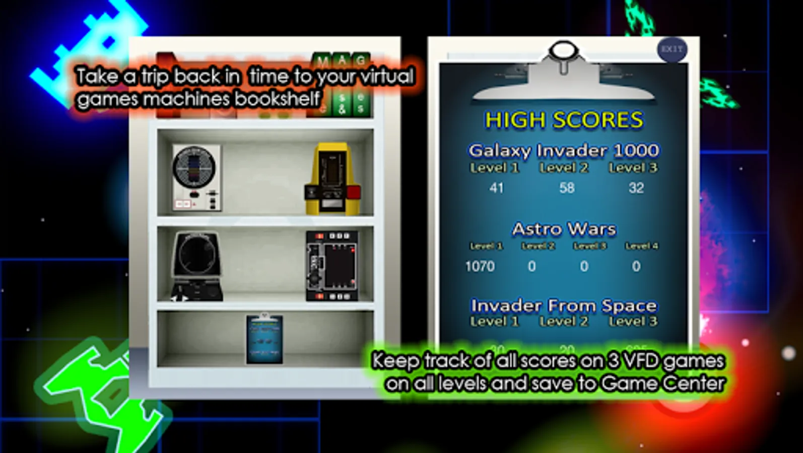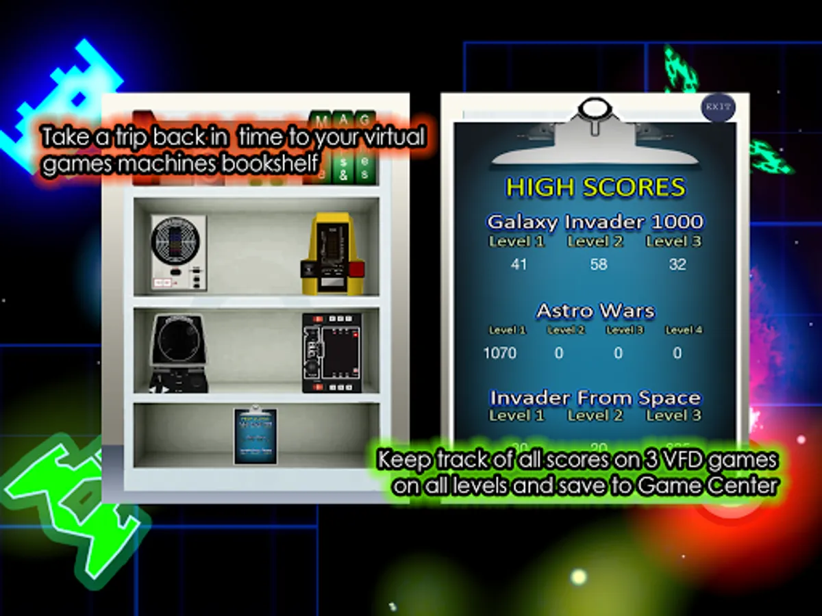• Keep track of scores of all levels on the 3 VFD games