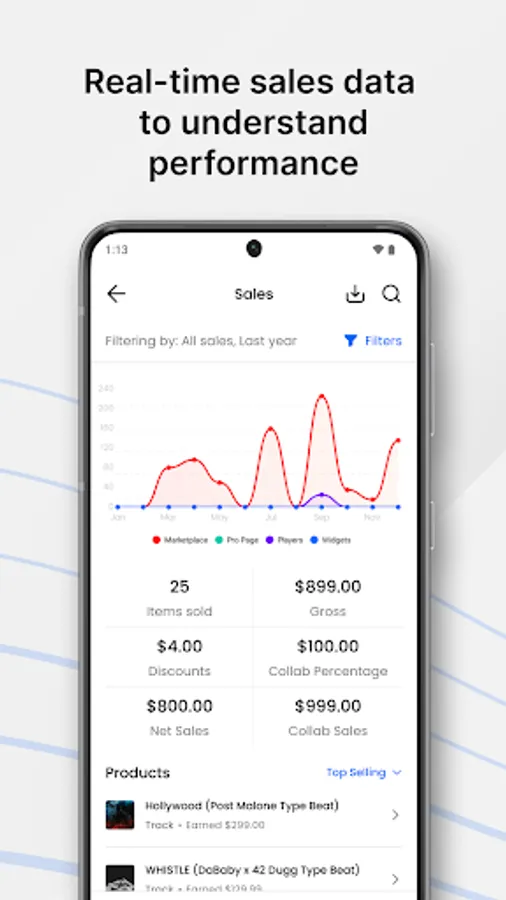 Advanced statistics & sales data: Stay informed with real-time and historical data on the performance of your tracks. Identify leading store sources, top performing tracks, new fans, and insights from top countries.