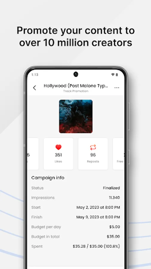 Promote tracks: Set up and manage your own campaigns to promote your tracks in front of millions of new potential customers - all from your fingertips.