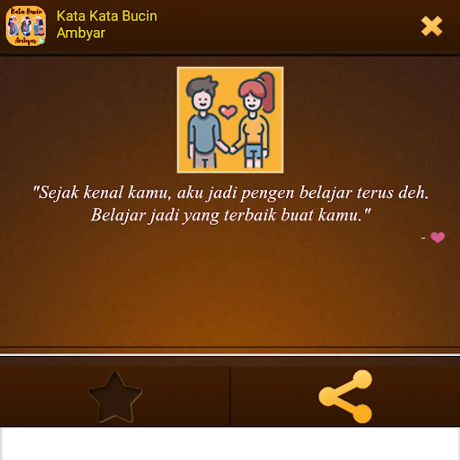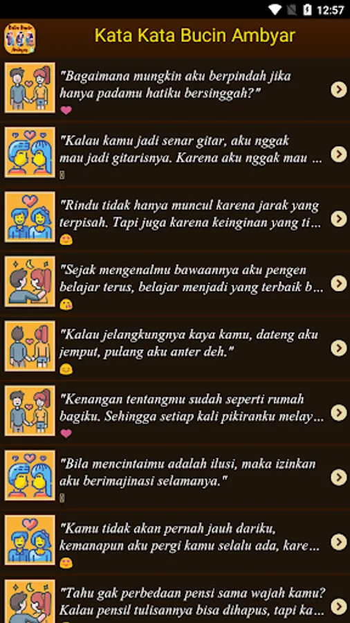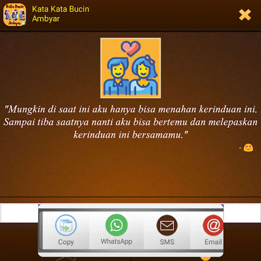 Application for pdkt with crush or boyfriend so that communication is smooth & successful. By providing very romantic flirtatious words, it can make your crush cramped. This application is great for those of you who like to make words of love full of meaning, with this application you can share romantic words by choosing good sentences and there is also a copy button feature, wa, which functions to share with people via social media.