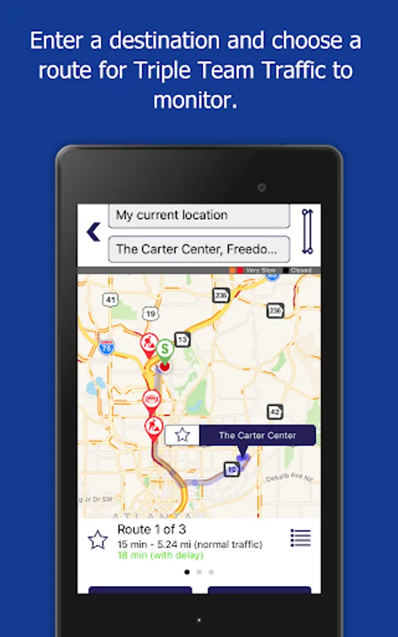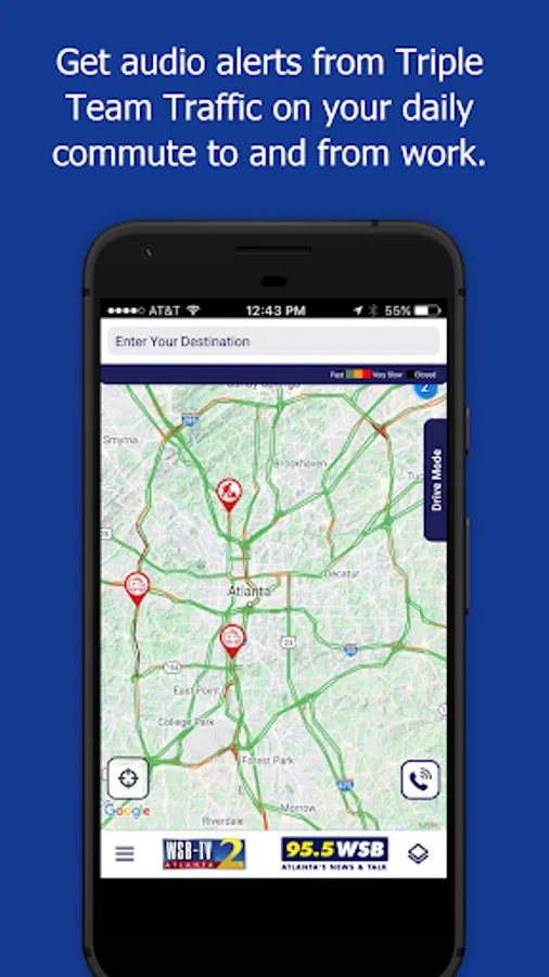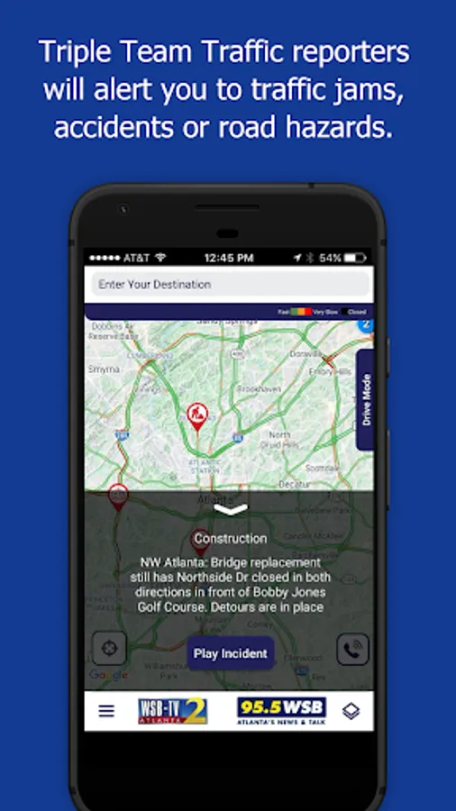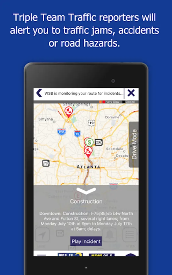 * Review the Map before you depart and easily see Incidents, Delays and Wrecks on your route, with text descriptions, and the WSB Traffic Reporters' audio reports. Or schedule notifications to alert you at your chosen time if there are any incidents on your route. Know Before You Go!
