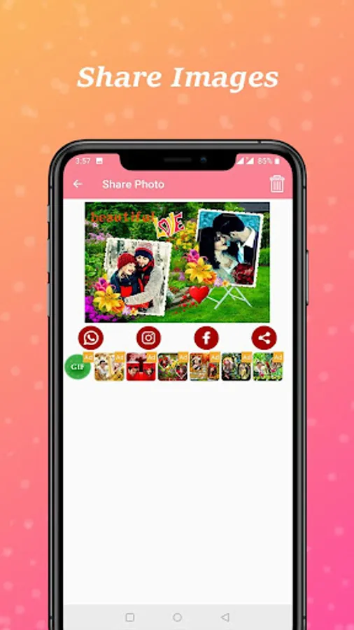 Select any photo from gallery or take a picture using camera and embed the photo of your choice into Beautiful dual photo frames.
