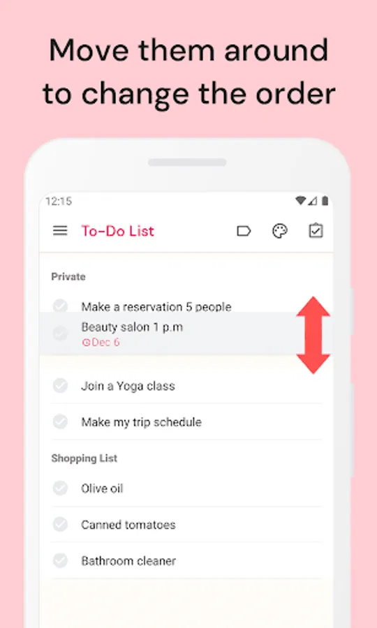3. Place your finger on the right of the items and move them up and down to reorder your lists easily. To delete an item, just move it to the right or left. LIST can be used easily with just one hand.
