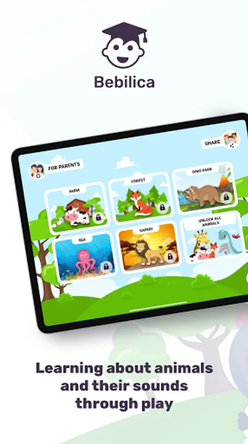 Bebilica Animals is an educational app that teaches and introduces a child to the animal world in a fun way through interaction. App includes animals from all over the world, which are divided into levels depending on the habitat in which those animals live in. In addition to getting to know the animals, each level also has a fun knowledge quiz, where the child has to guess where the requested animal is through audio-visual cognition. The application is specially made for children aged 2+ and is the perfect choice for modern, fun and smart learning of a child.