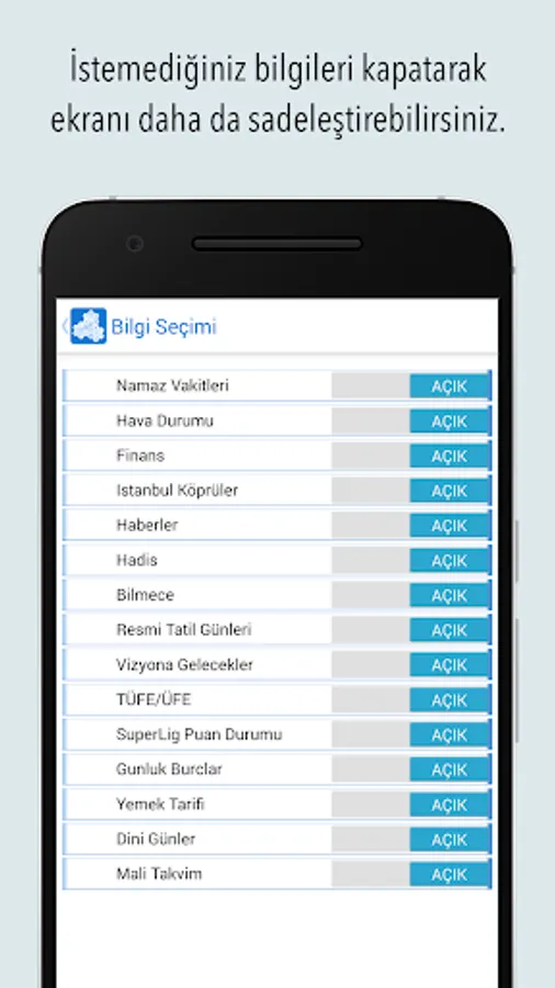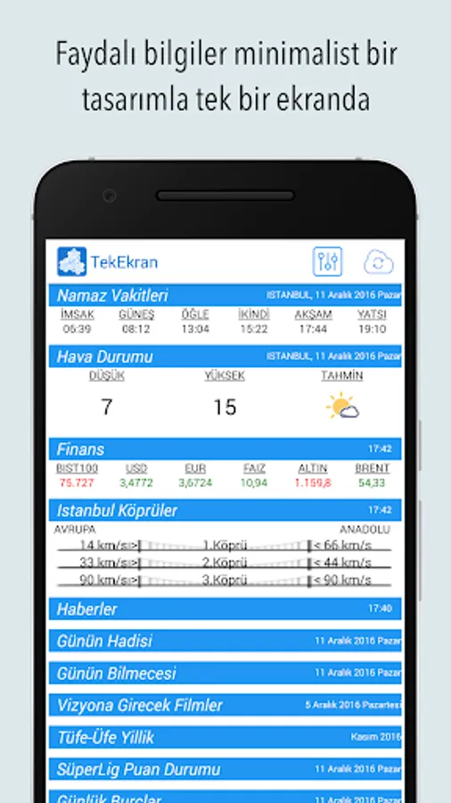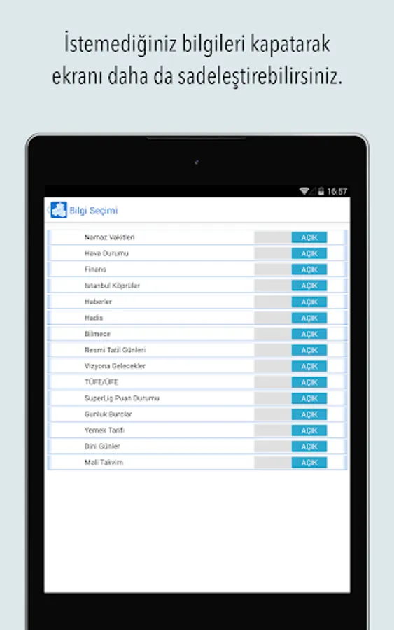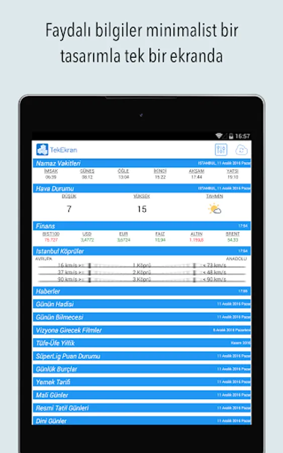 Prayer Times, Weather Forecast, Financial Indicators, Istanbul Bridge Traffic, News, Hadith, Riddles, Visionary Movies, T-Shirts, Superligation Points, Horoscopes, Recipes, Public Holidays, Religious Days, Films in Vision, Today in History, Flight information, PTT Cargo Tracking, Pharmacies, weekly comic, Market Campaigns, TRT Children Streams, Football Live scores, TEPAV Retail Confidence Index, Istanbul Chamber of Industry, Turkey Manufacturing PMI Report, Retail Sales Index, Housing Sales Statistics, Financial Investment Instruments of Real Return Rates, Motorized Road Vehicles Sales Graph, Consumer Confidence Index, Economic Confidence Index, Industrial Production Index, Labor Force Statistics, Diyanet Friday Hutbesi