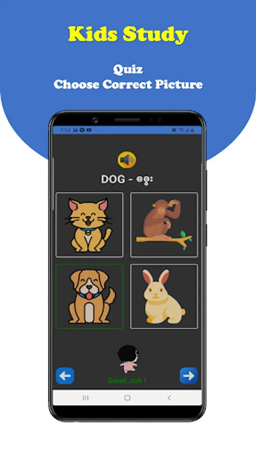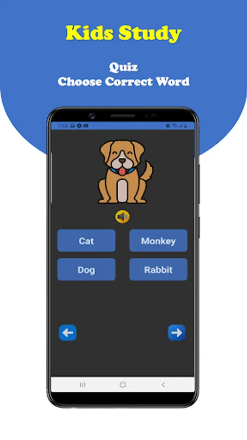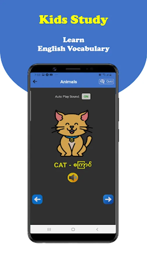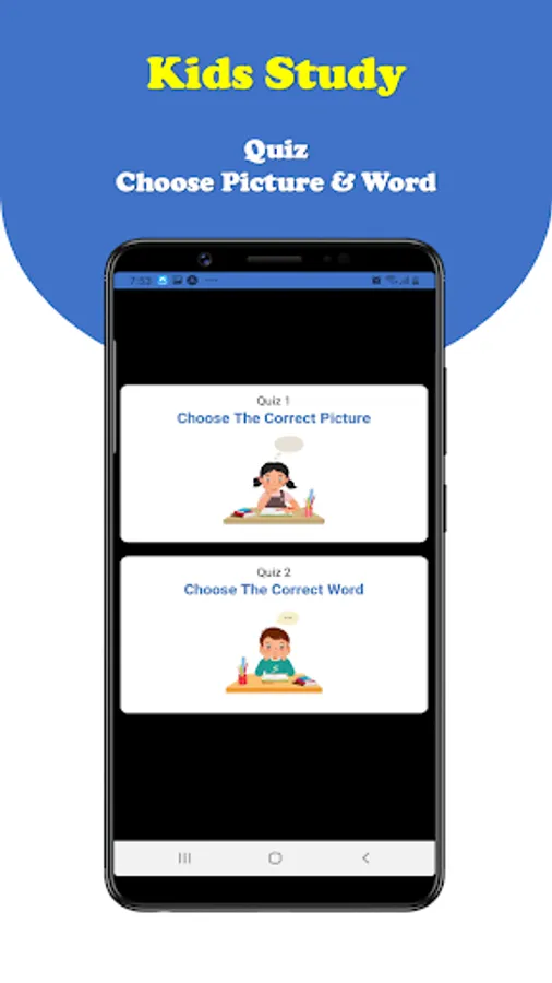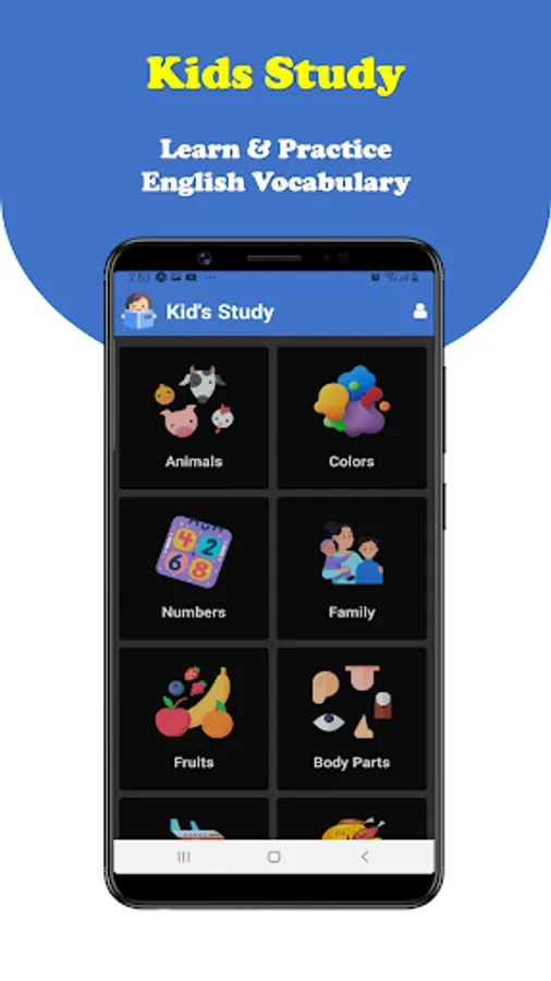 Kids Study App is designed to help children learn English vocabulary. Activities include reciting pronunciations, recognizing words with pictures, and answering puzzles. Some images are animated as gifs.