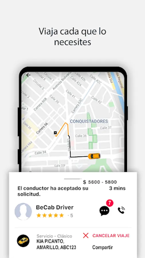 3. Once a closer driver accepts your request, you will be able to see their information and that of the vehicle in which you will be traveling. You will be able to review the location of the driver and the time it will take him to get you. In addition, you can contact him through messages or calls.