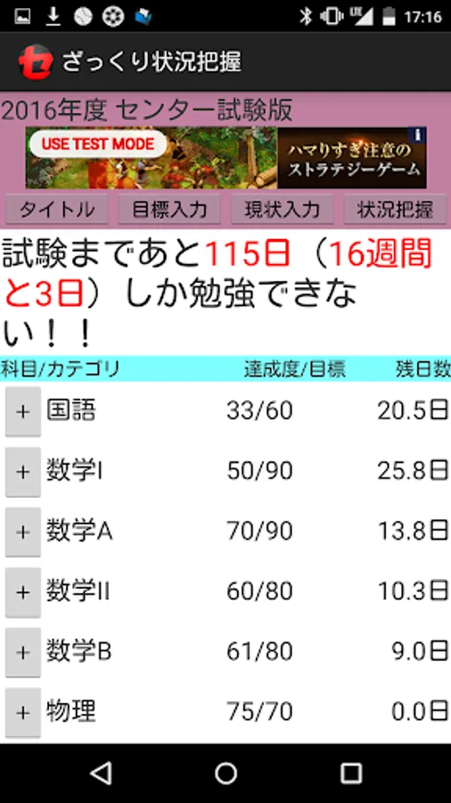 状況把握 センター試験 2019年度 カウントダウン 計画 スケジュール ウィジェット 進捗率 達成度 週 日