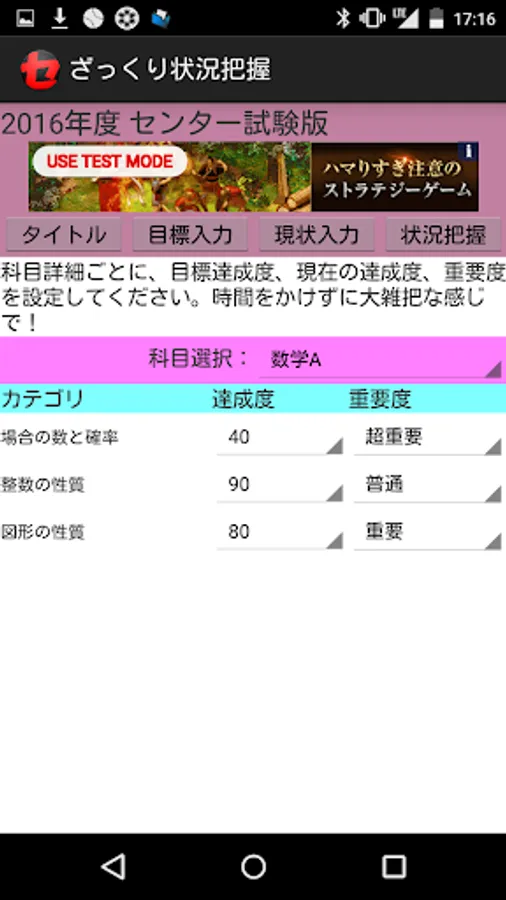 各科目のカテゴリ(単元)ごとに、現在の達成度を入力・更新します。