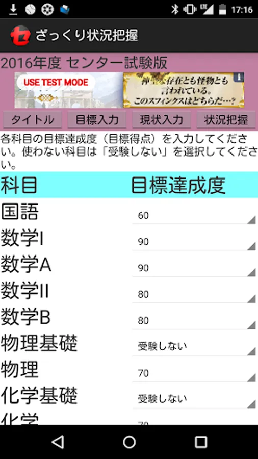 各科目の受験する/しないの設定と、目標達成度(目標得点)の設定をします。