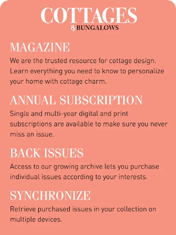 Cottages & Bungalows is a unique cottage-style magazine packed with inspiring home décor ideas. From a beach cottage to a country coastal bungalow, you’ll find all the interior design tips and advice for decorating your home. Also get great designer ideas for managing space and room decoration for a small home. With great DIY projects, you can now create a cottage lifestyle in any home. And the bestselling Cottages & Bungalows app delivers all this exciting content in a convenient digital magazine subscription.