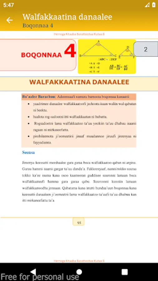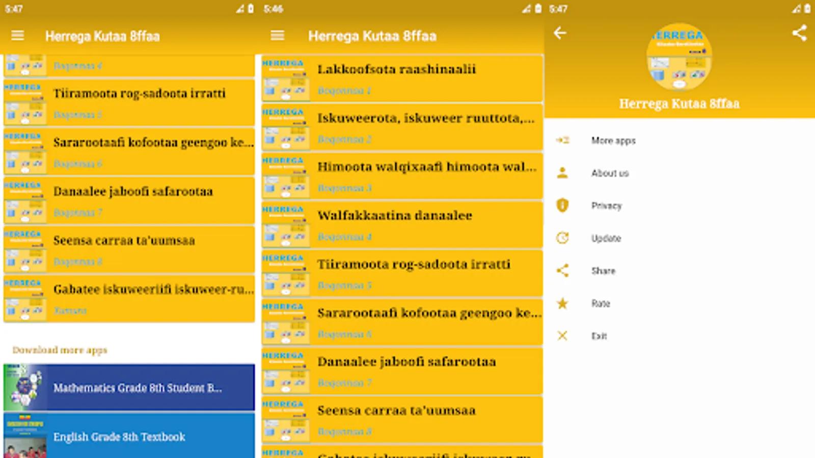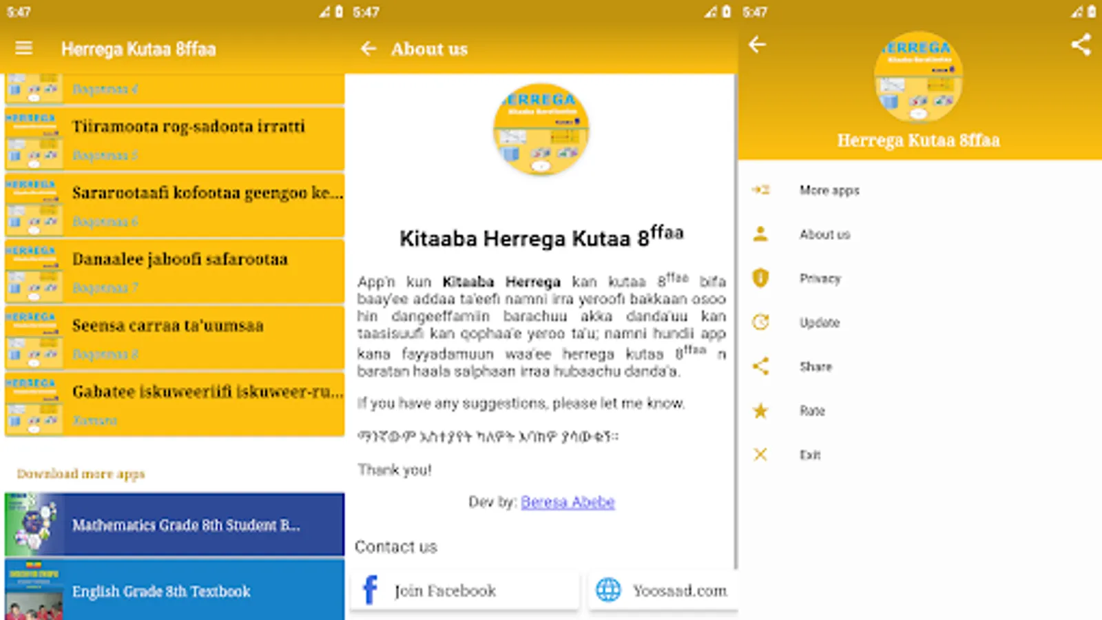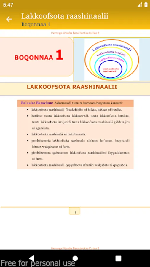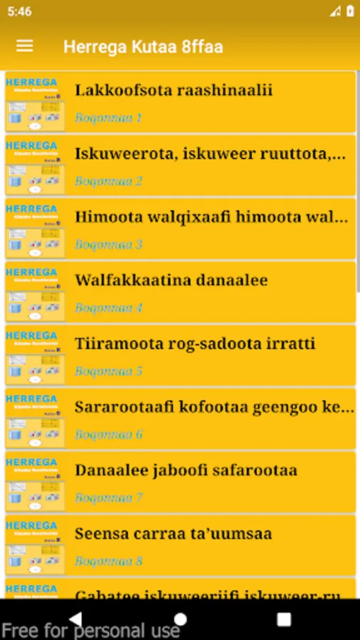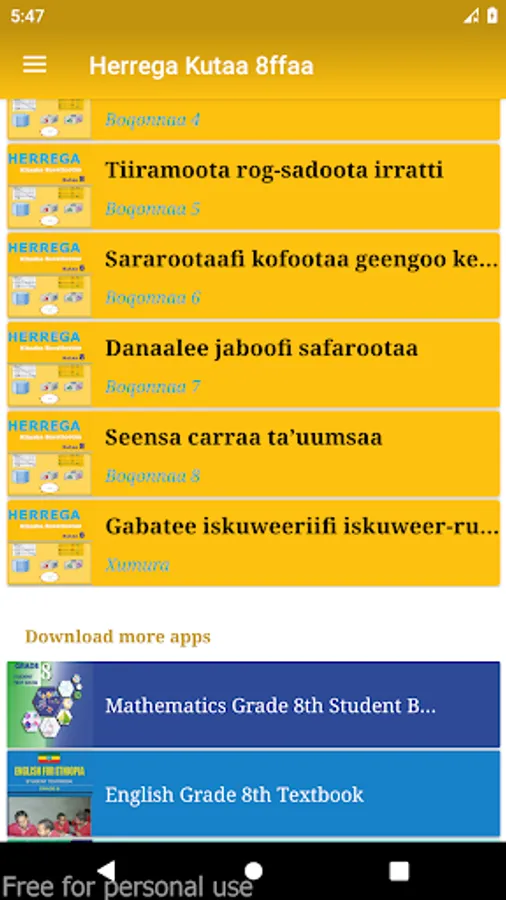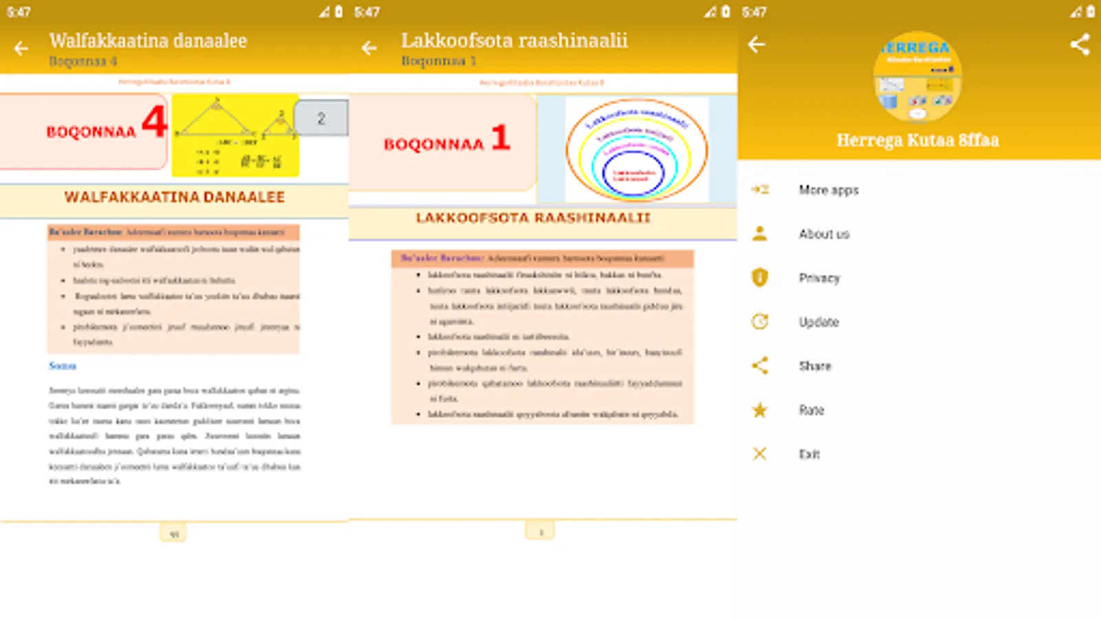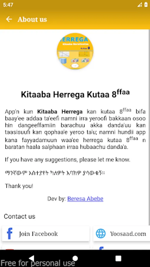 App kana keessatti kitaaba herrega kutaa 8ffaa afaan oromoon kan baratamuu hundaa kan keessatti boqonnaa boqonnaan isiniif qinda'ee waan ta'eef bifa baay'ee salphaafi namatti tolun barachuu ni dandeenye. Kitaabni kunis namni akka itti tolutti guddisuufi xiqqeessuun ilaalu kan kan danda'u taasisuun qoophessinerraa. Namni hundii app kana yoo fe'ataan fayyadamaa malee midhaa hin argittaan. Data nutti ol sassabnuus hin jiru. Wantii hundii bilisaan akka isin bira ga'uu taasisne jira.