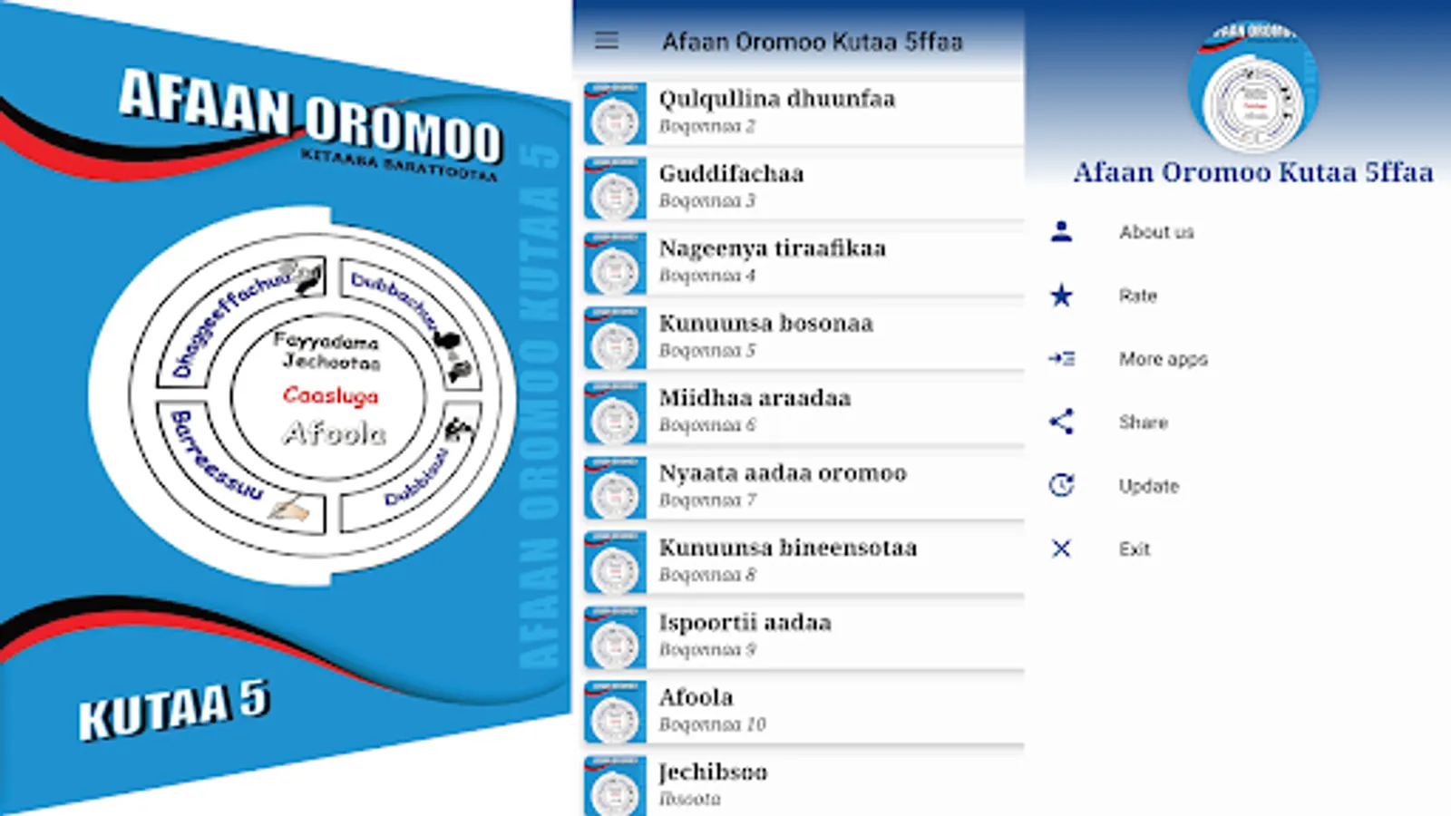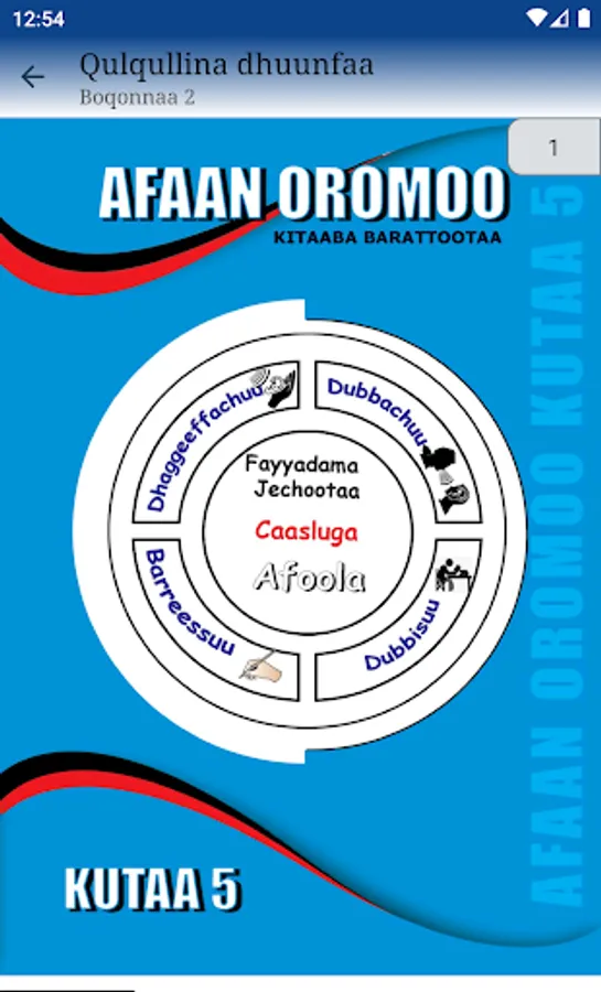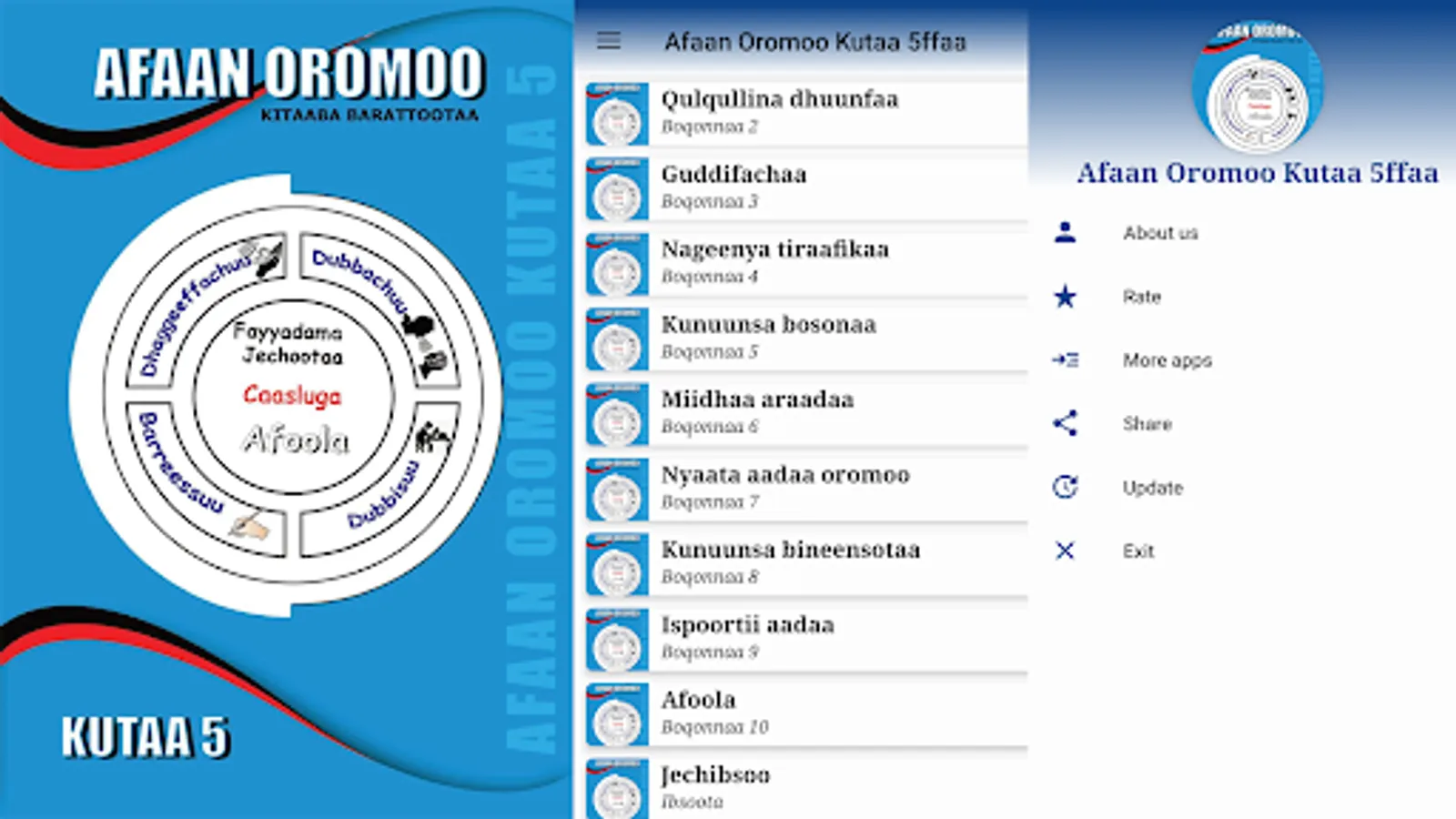 App'n kun Afaan Oromoo kutaa 5ffaa bifa salphaafi namatti toluun waan qophaa'eef namni manaatin kitaaba dagadhe osoo hin jedhiin bakkafi biyya jiruti itti fayyadamuu akka danda'uuf kan dhiyaatedha. Qoqqoodamni boqonnaa kanas baay'ee ifaafi namatti akka toluun waan ta'eef namni kam iyyuu itti fayyadamuuf dhamatti isa hin barbaachisu.