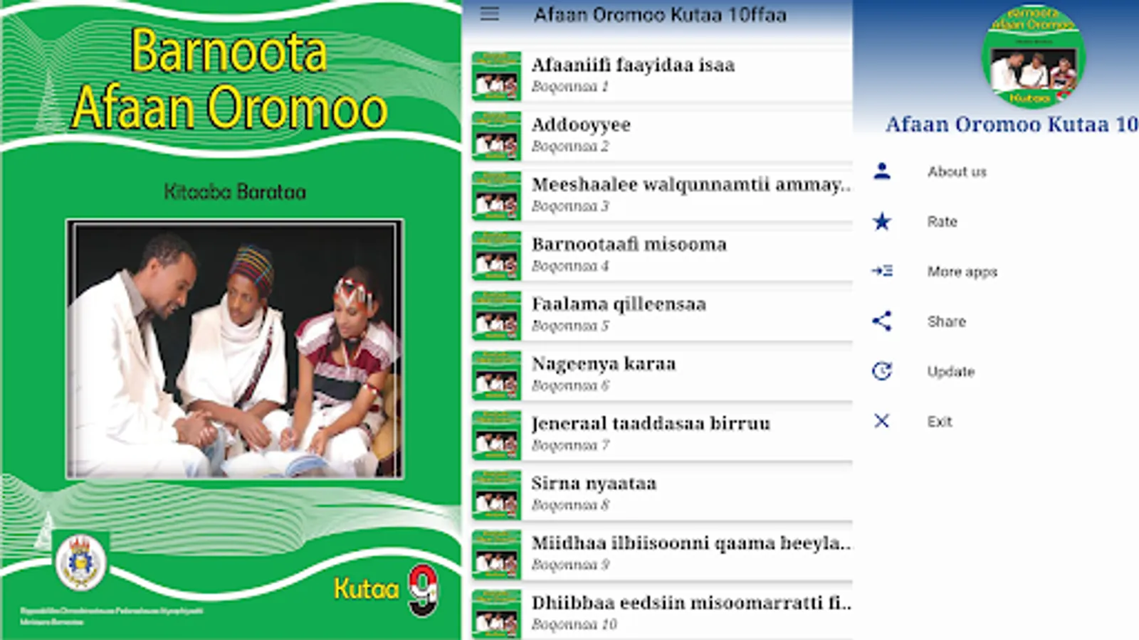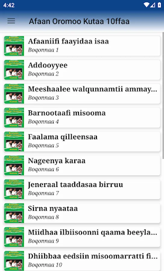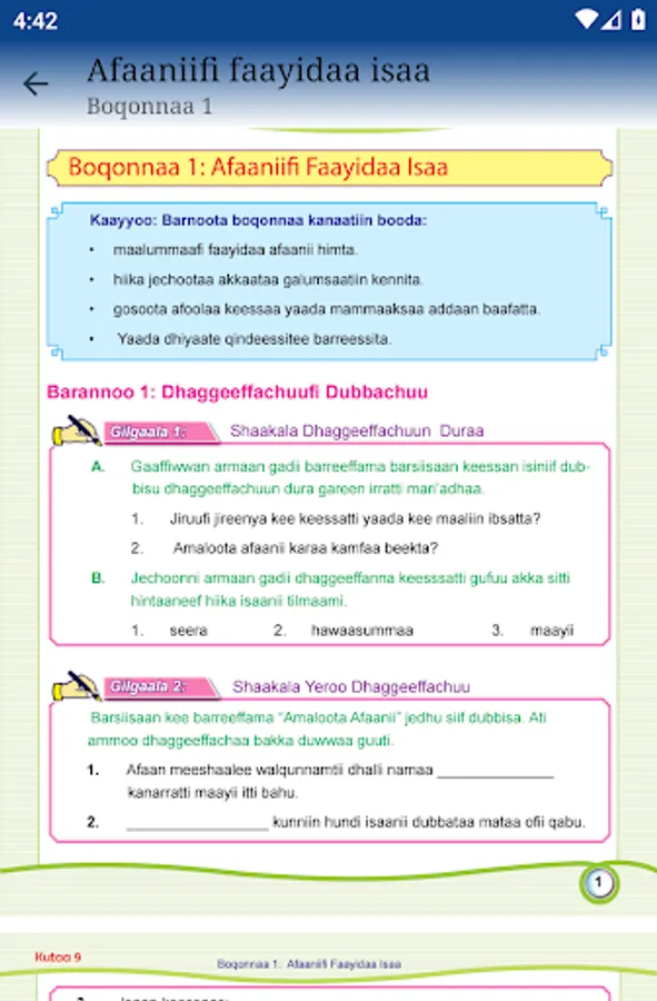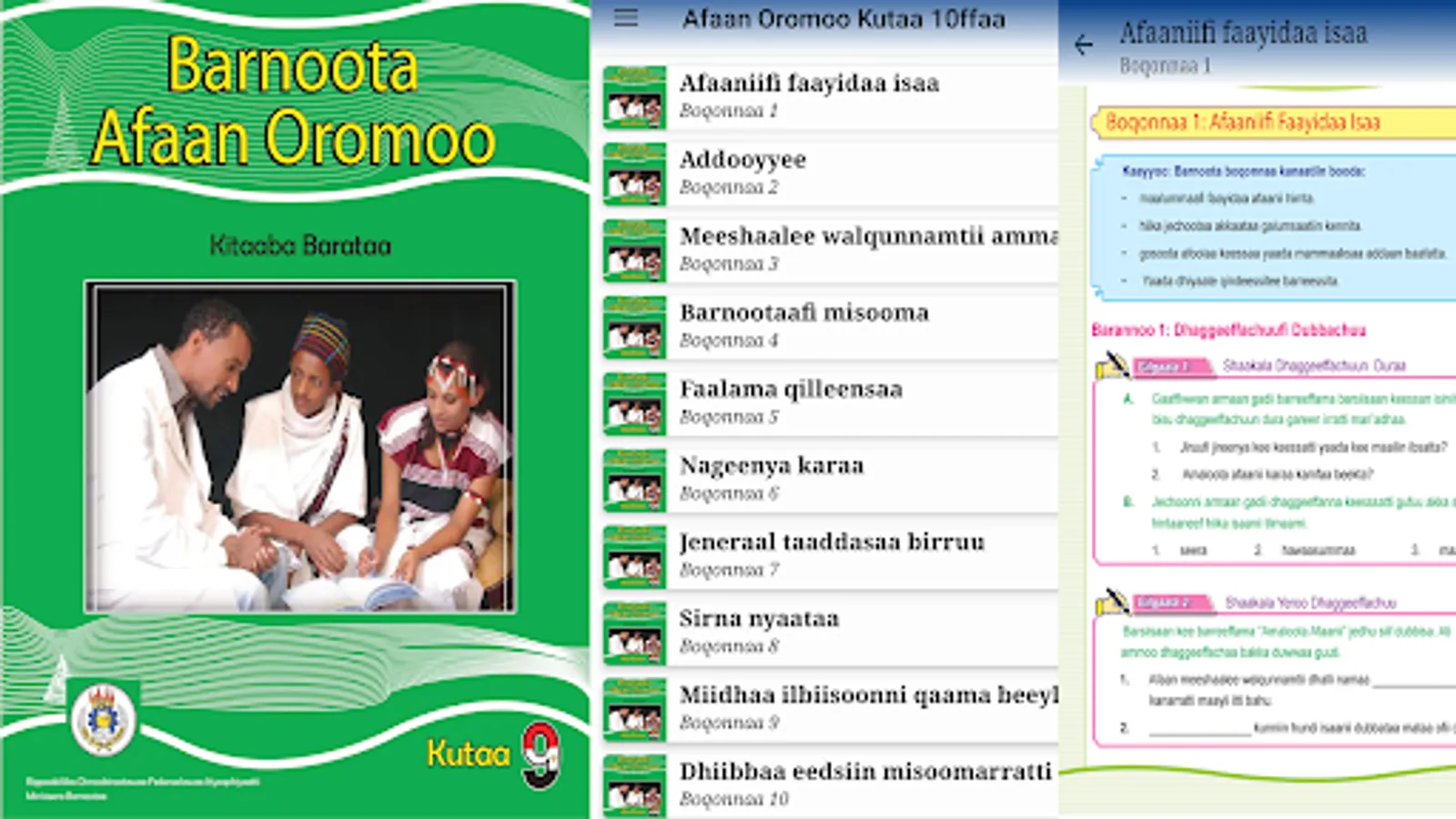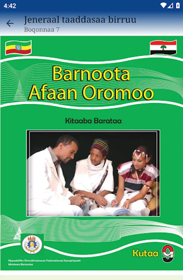 This app is designed to help students and teachers for teaching and learn grade 9th Afaan Oromoo. All the application contents and their arrangements are according to the normal student textbook. There are no complaints about this application since all the contents completely match the students' textbooks. This app is designed to help and make teaching and learning methodology easier. By using and installing this app on your smartphone you don't worry about having the book on or not. Because whenever you go, your phone will always stay with you. You can use it anywhere and everywhere.
