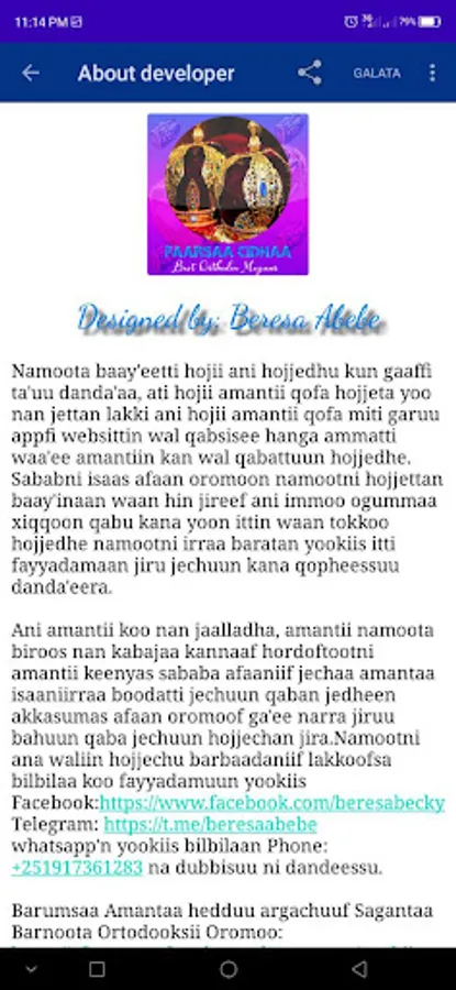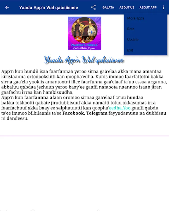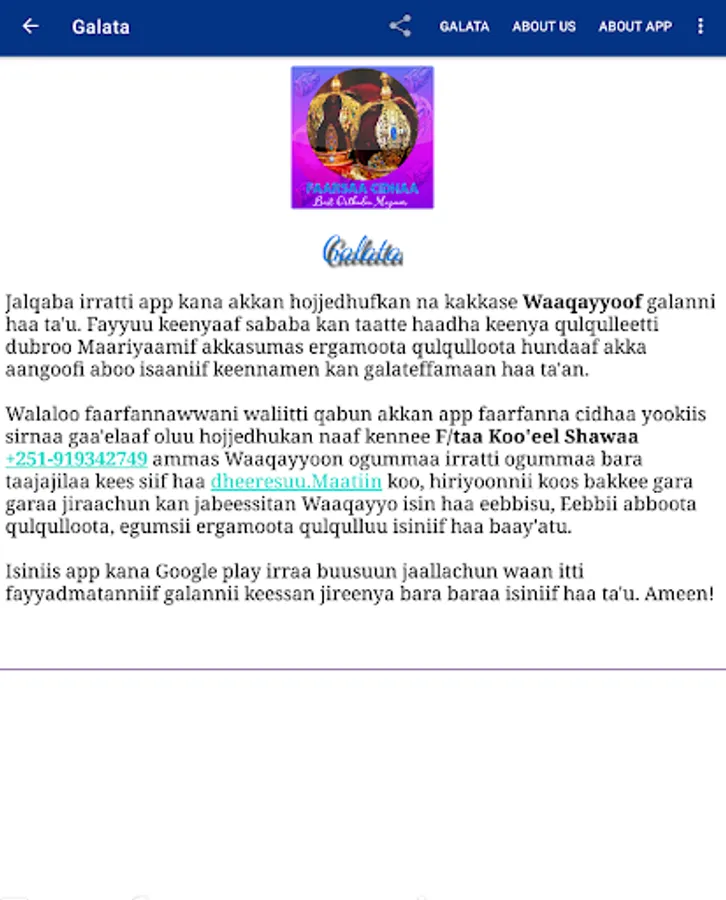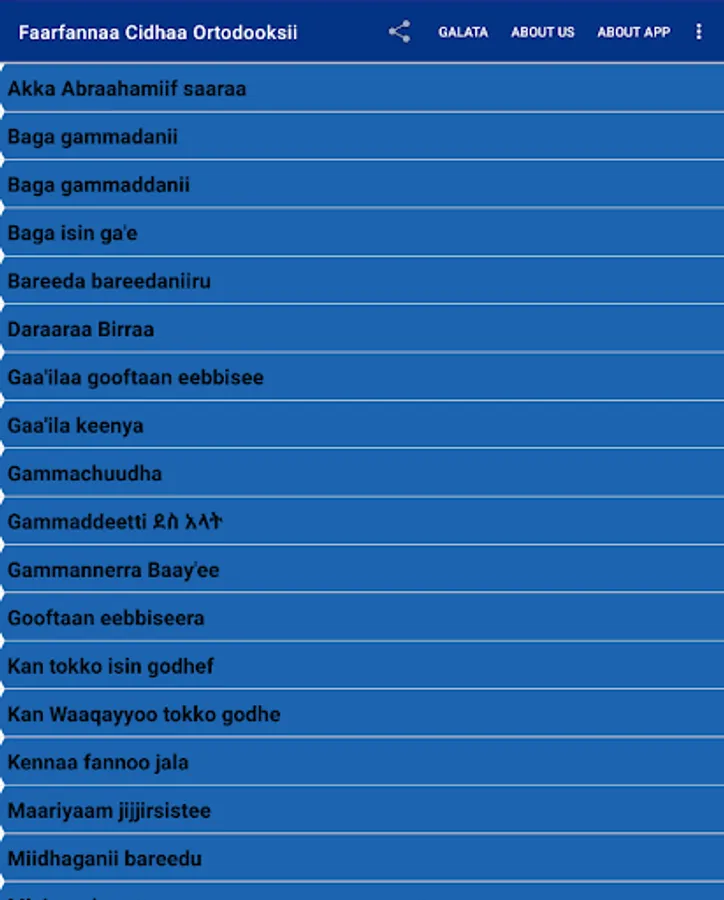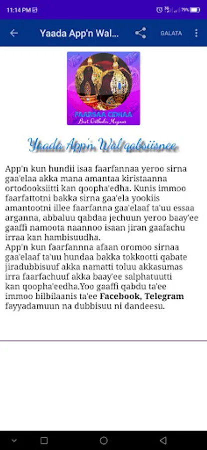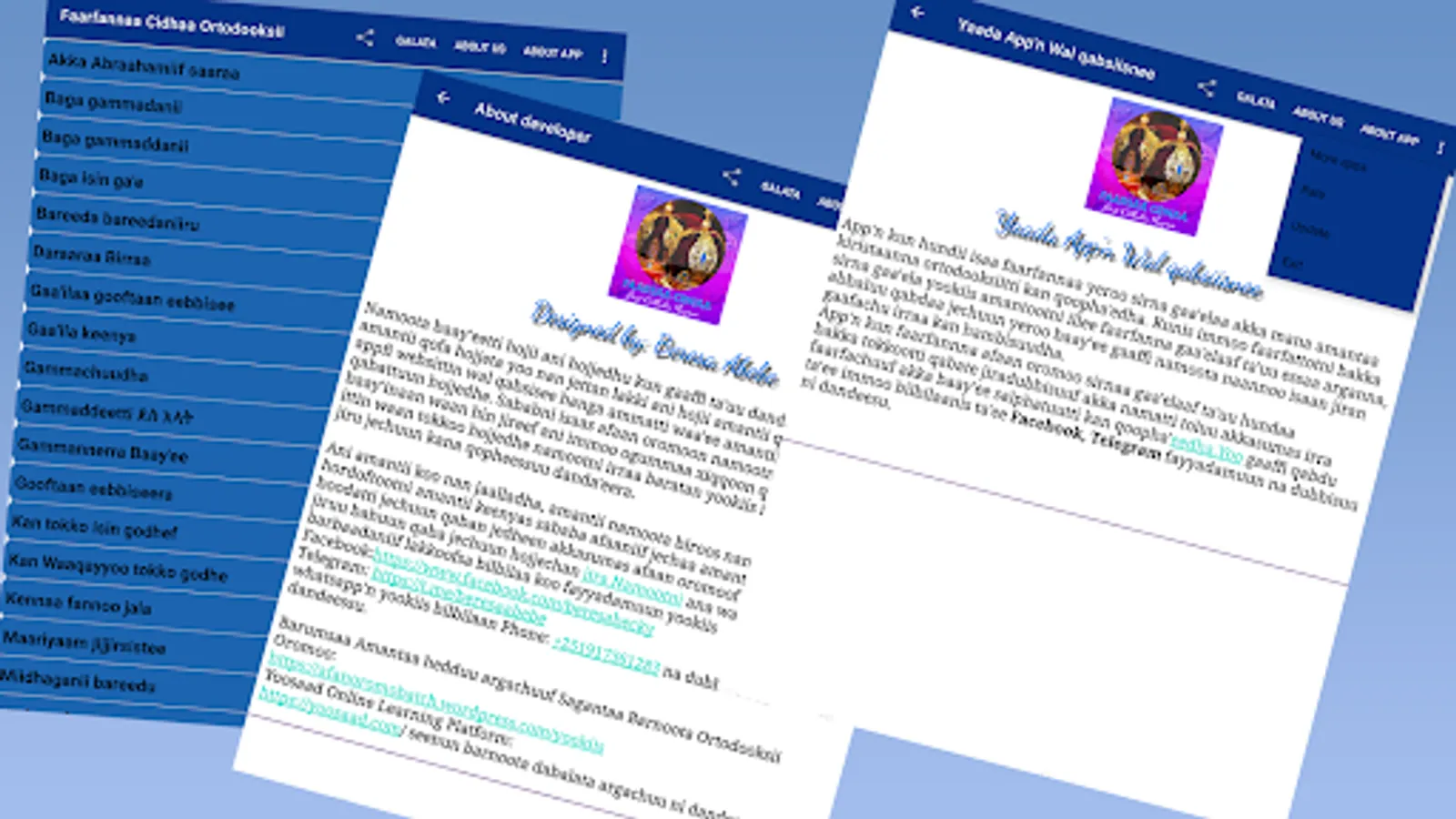 App'n kun faarsaa yeroo cidhaa bakka adda addaatti akka seeraf sirna mana amantaa kiristaanna ortodooksiitti kan qophaa'eefi qindaa'eedha. App kana keessatti dhimma dhuunfaan wal qabsiisnee daata nutti ol sassabnu tokko illee hin jiru. App kana bilisan bilbilaa keessan irratti fe'uun fayyadamu ni dandeessu. App kana fe'uun yoo rakkoon isiin muddatee immoo lakkoofsa bilbilaan yookaan facebook irraan nuu dubbisaa.