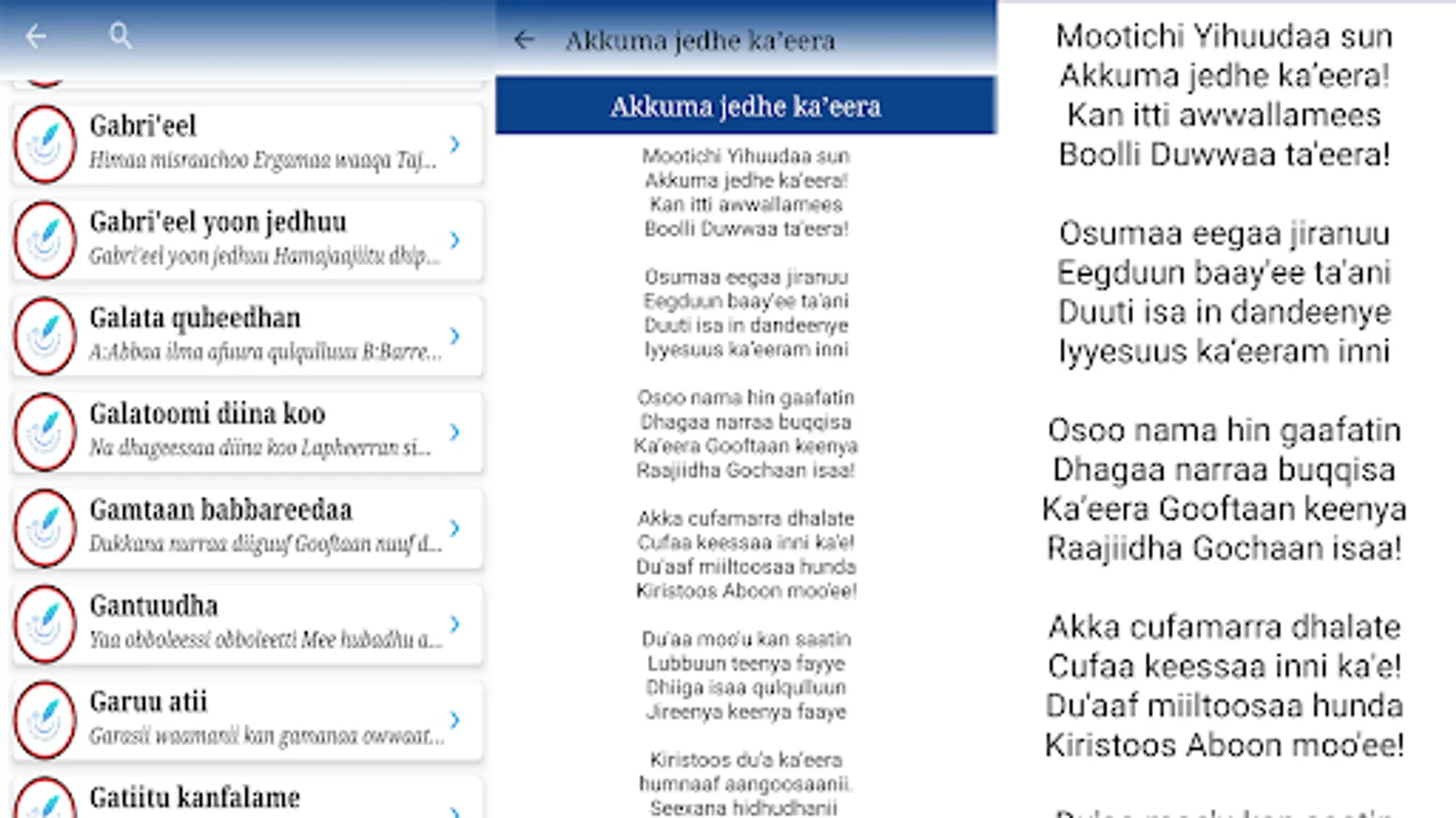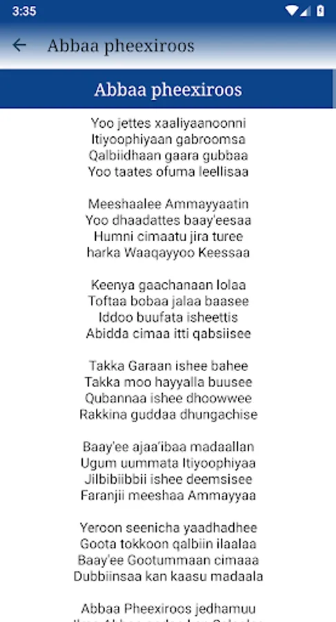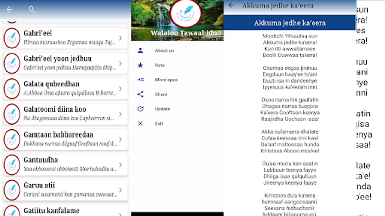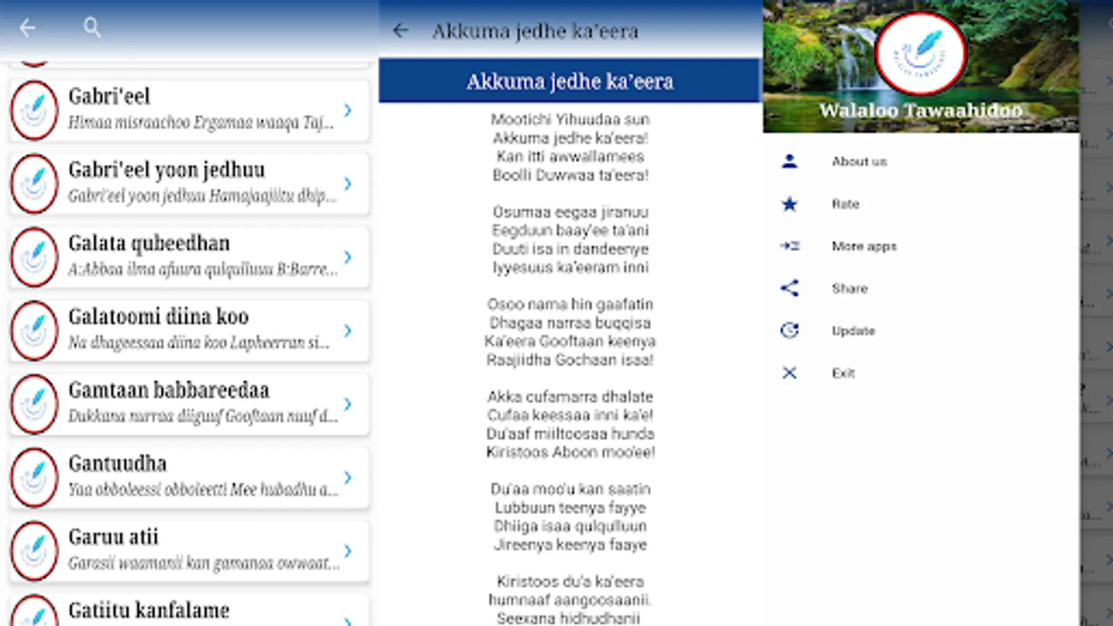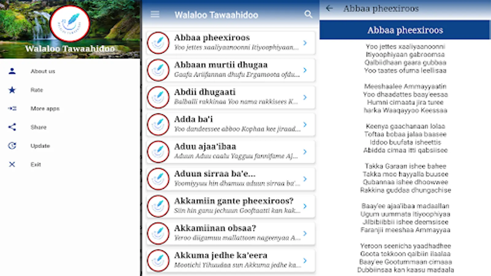 App'n kun walaloo tawaahidoo afaan oromoo ta'aan 150 ol kan of keessaa qabu yeroo ta'u, namni kam iyyuu bifa salphaan bakka jiruutti play store irraa buufachuun itti fayyadamuu ni danda'a. Walaloo kunis F/taa D/n Koo'eel Shewaan kan qindaa'eef walitti qabamee yeroo ta'u, yaada waa'ee walaloo kanannis ta'ee gaaffi waa'ee amantiin kan wal qabatuu hundaaf deebii yoo barbaadanis kallattin lakkoofsa bilbilaa +251912203344 irratti bilbiluu gaafachuu ni dandeessu.