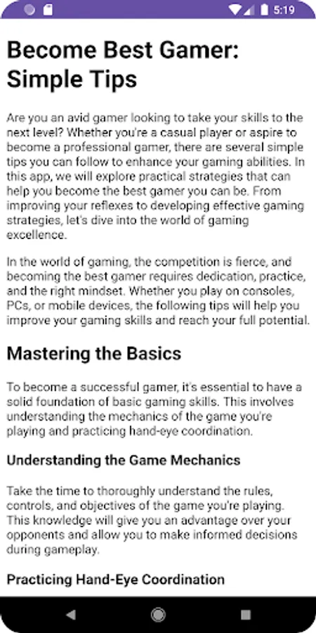 One of the standout features of Become Best Gamer: Simple Tips is its user-friendly interface, designed to provide a seamless and immersive experience. The app is intuitively organized, allowing you to navigate effortlessly through various sections and access the tips that matter most to you. Whether you're looking for advice on improving your aim in first-person shooters or enhancing your decision-making skills in strategy games, the app has you covered.
