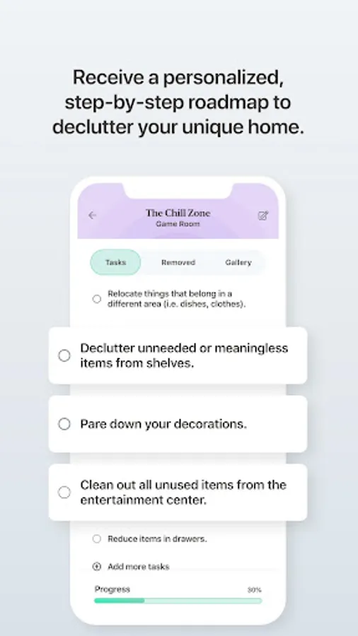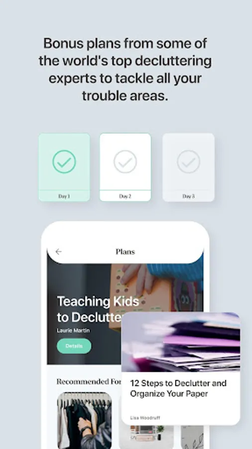 With the Clutterfree app, you will receive a personalized, step-by-step roadmap to declutter your unique home. Also, you can track your progress, find inspiration, complete challenges, and discover specific bonus plans from some of the world's top decluttering experts.