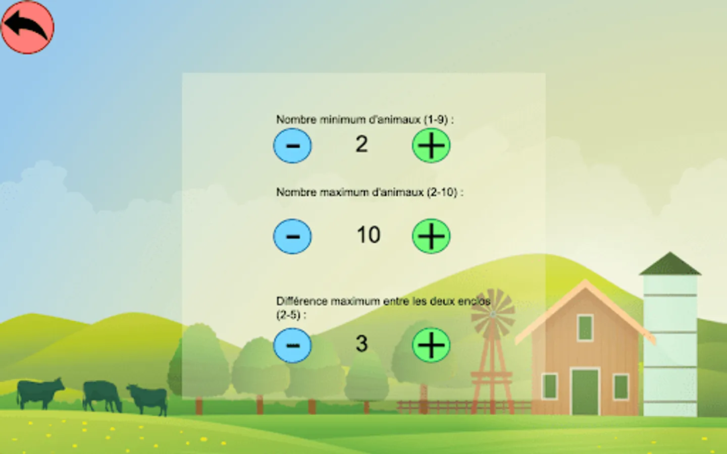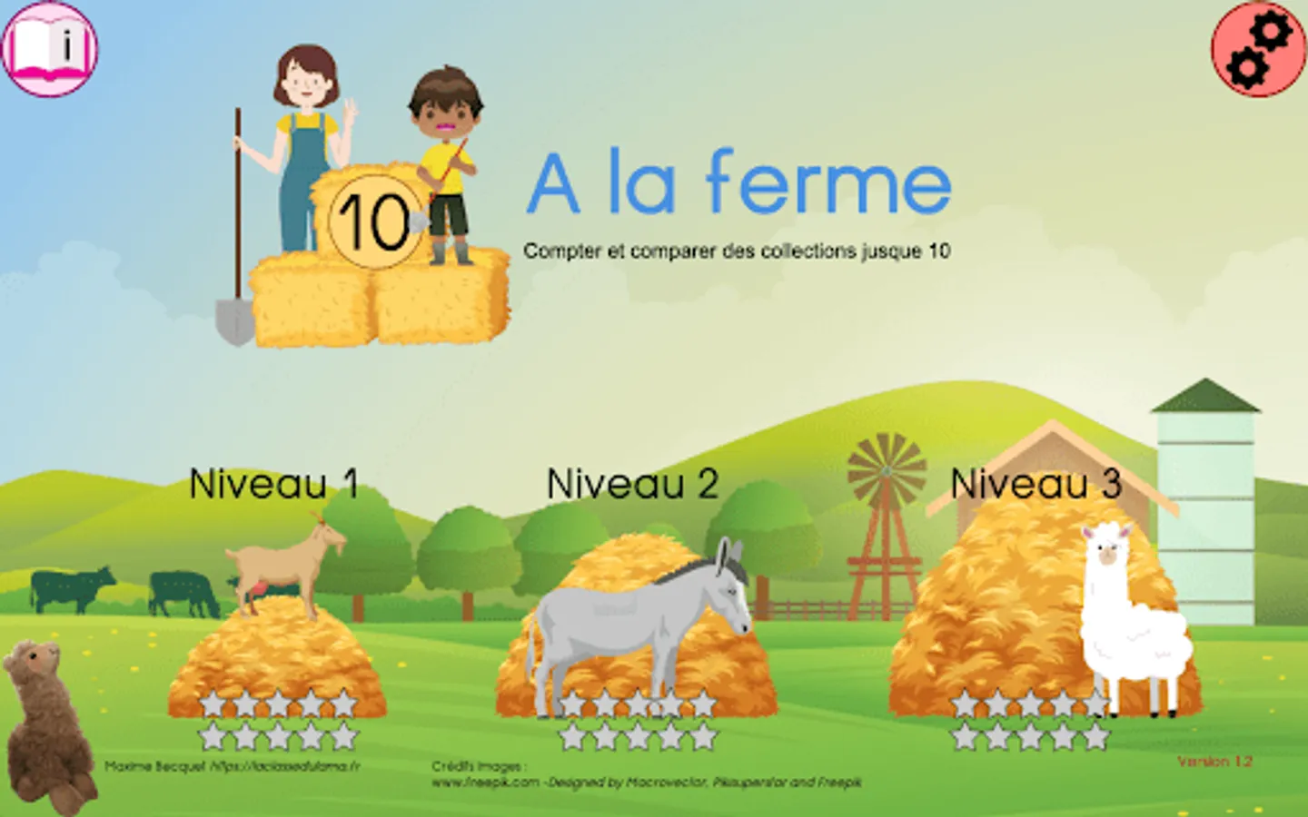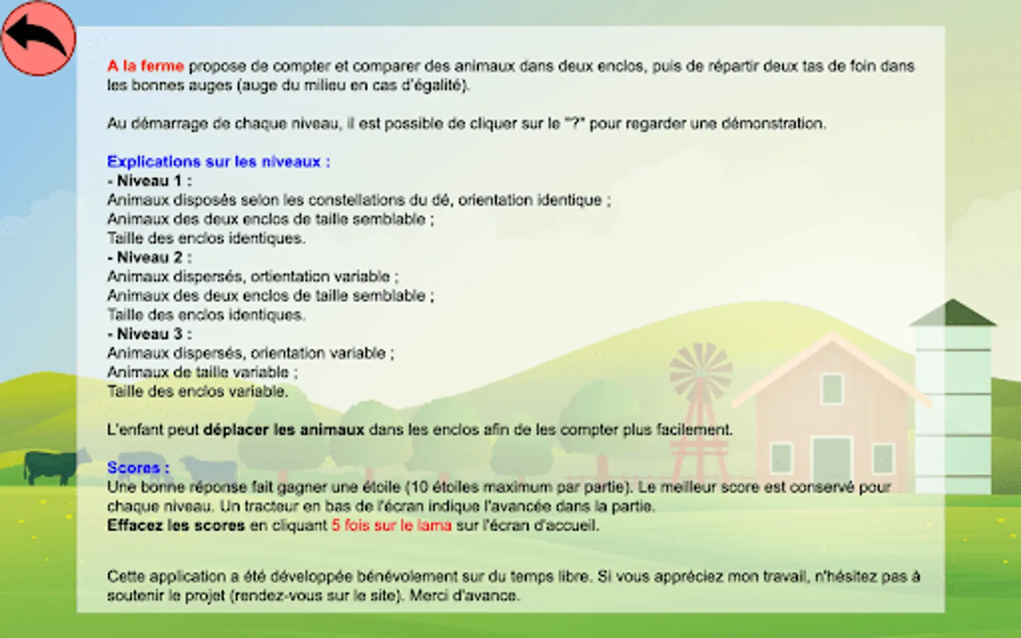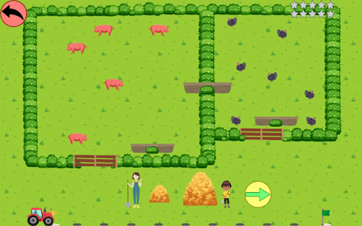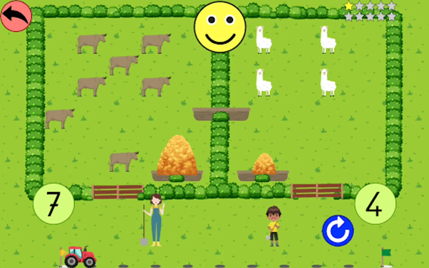 A correct answer earns a star (10 stars maximum per game). The best score is kept for each level. A tractor at the bottom of the screen indicates the progress in the game.