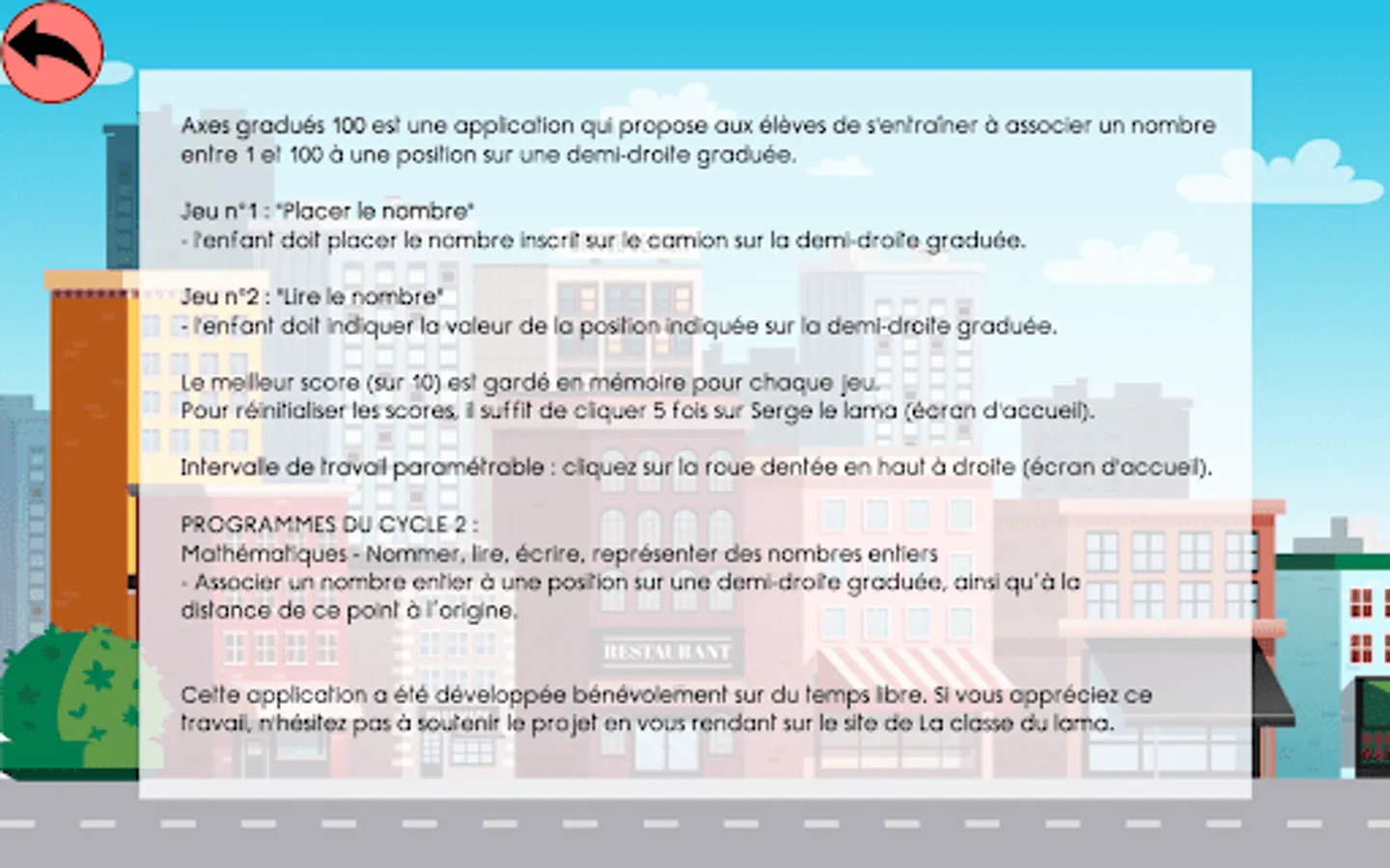 Graduated Axes 100 is an application that allows students to practice associating a number between 1 and 100 with a position on a graduated half-line.