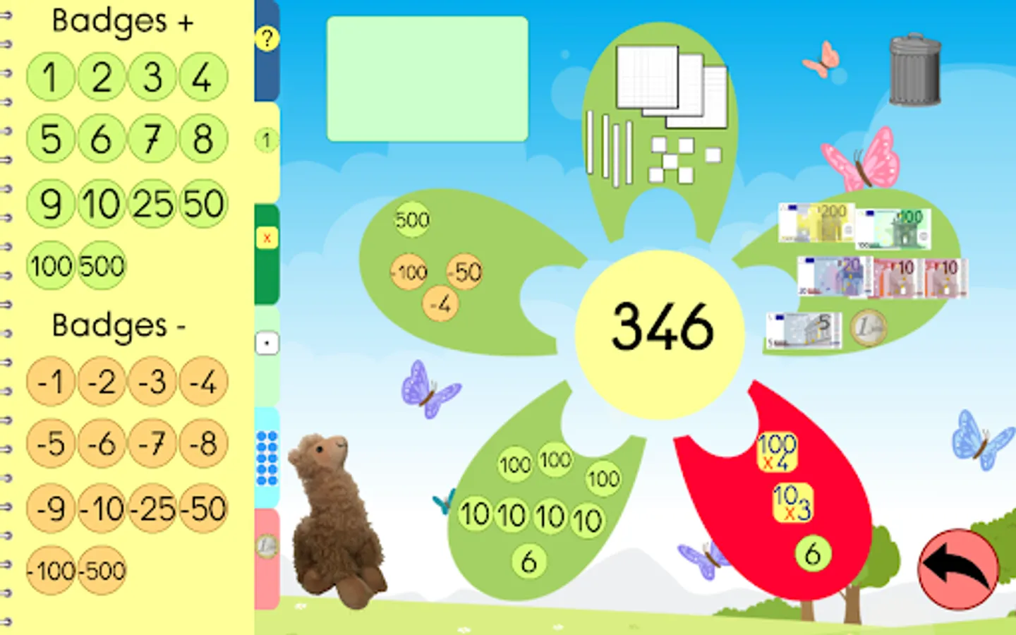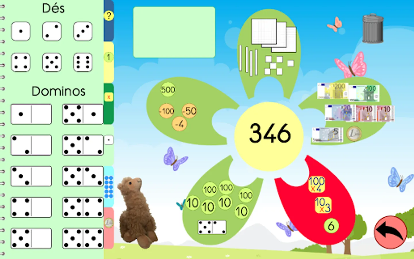 - represents the target number on each of the petals using the different labels available: tokens, coins, cubes, etc.