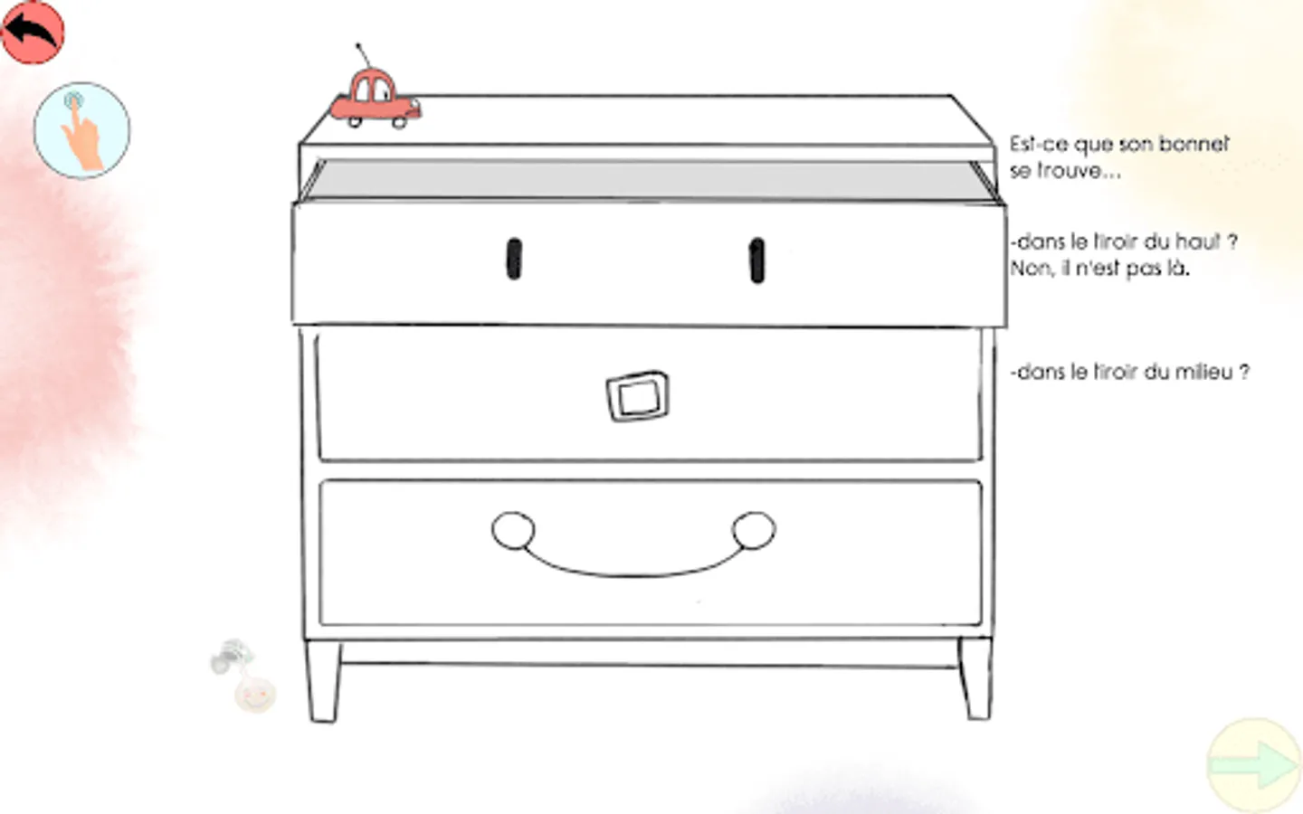 The educational objective of this story is the acquisition of positional vocabulary: in front, behind, above, in the middle, etc.