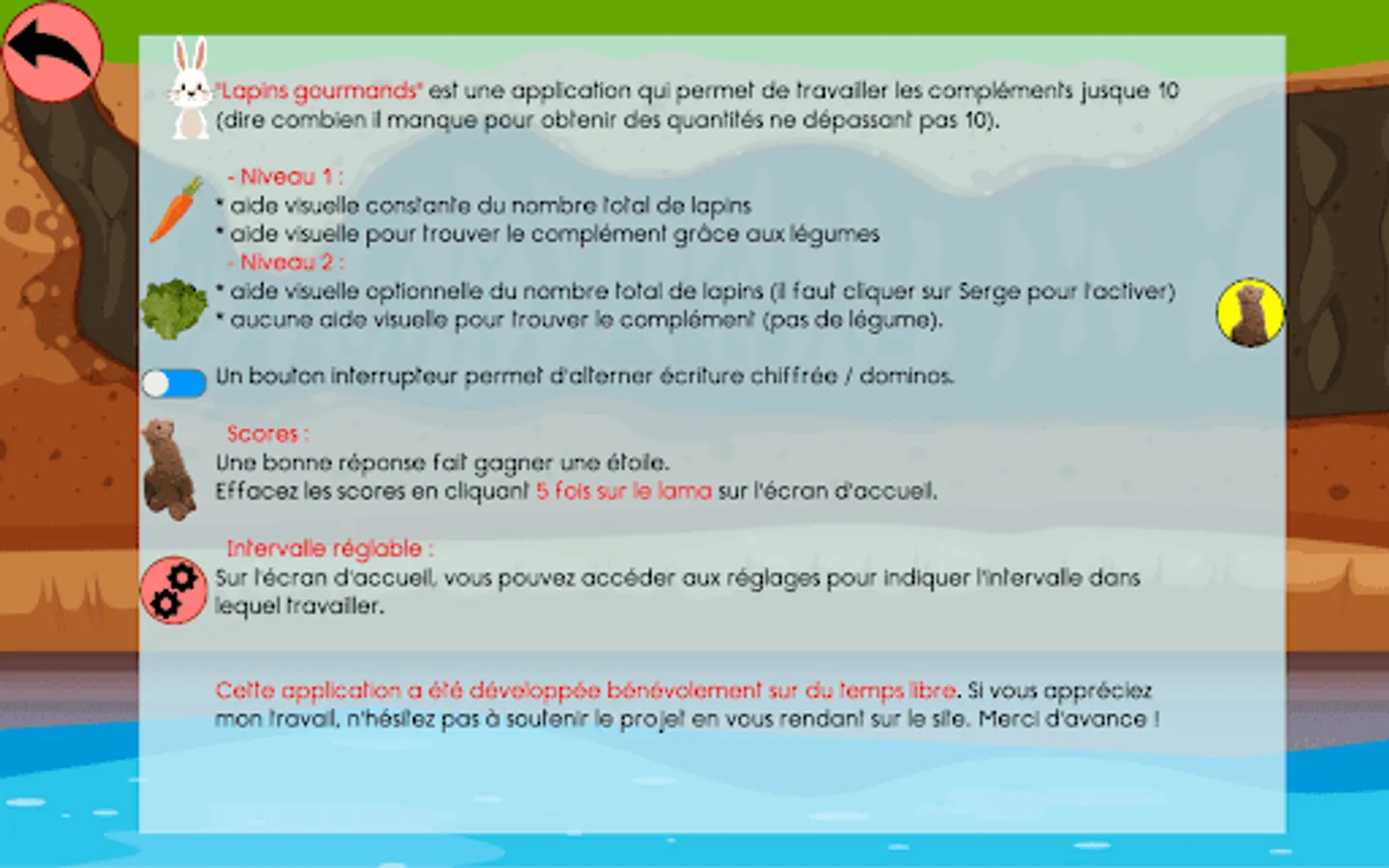 A switch button allows you to alternate encrypted writing / dominoes. A correct answer earns a star (clear the scores by clicking 5 times on Serge the llama on the home screen).