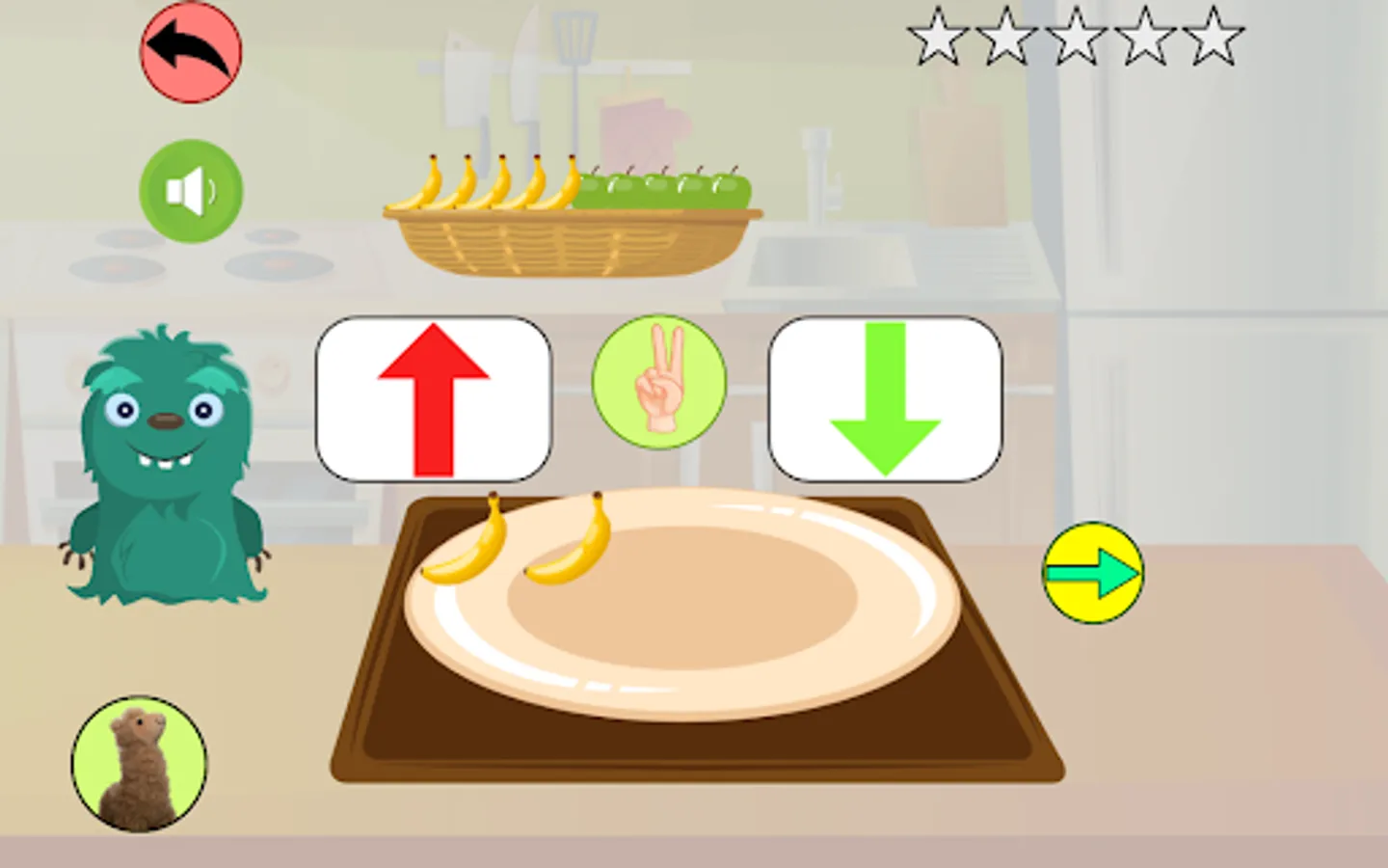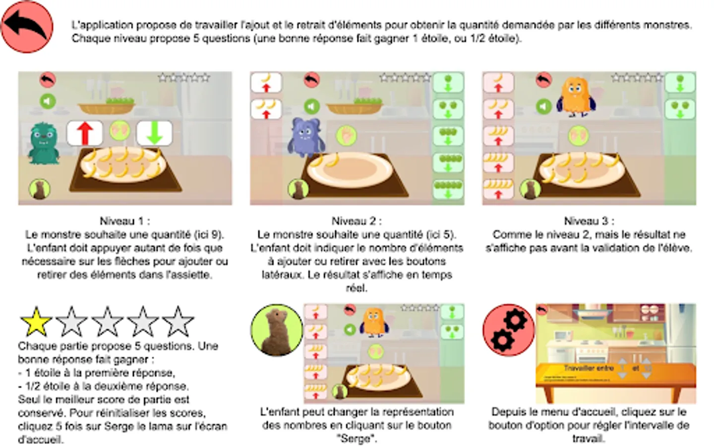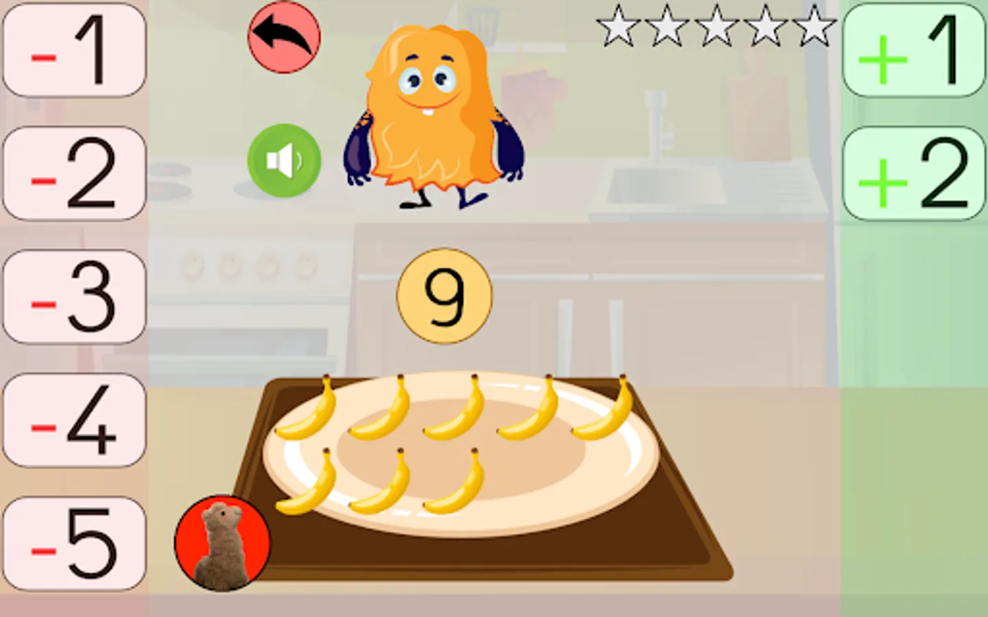 Elements (fruits, vegetables...) are on a plate. The monster wants a different amount, indicated above the plate. The child must therefore add or remove elements to obtain the desired quantity.
